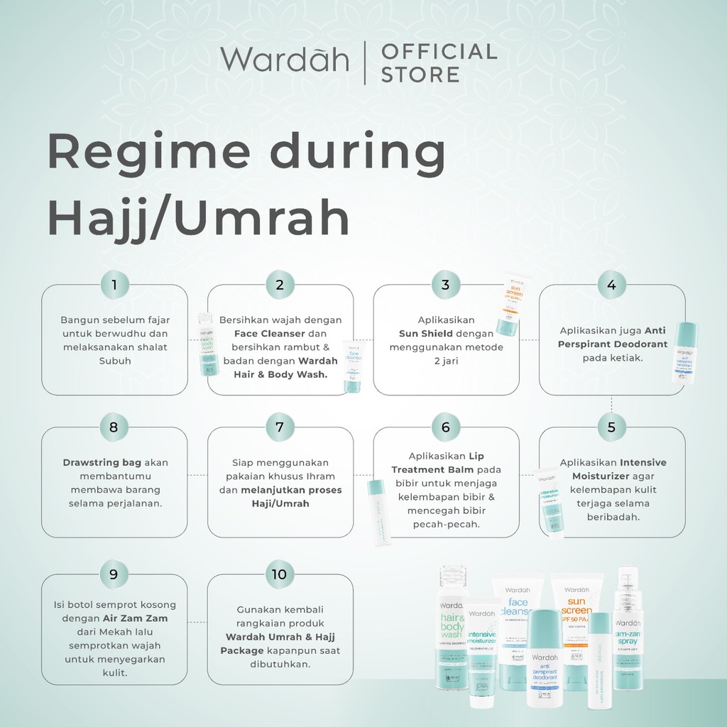 WARDAH Umrah & Hajj Package - Paket Haji dan Umroh - Facial Wash, Moisturizer Pelembab Wajah, Sunscreen SPF 50 PA+++ , Antiperspirant Deodorant, Hair and Body Wash, Lip Balm, ZamZam Water Spray - Skincare