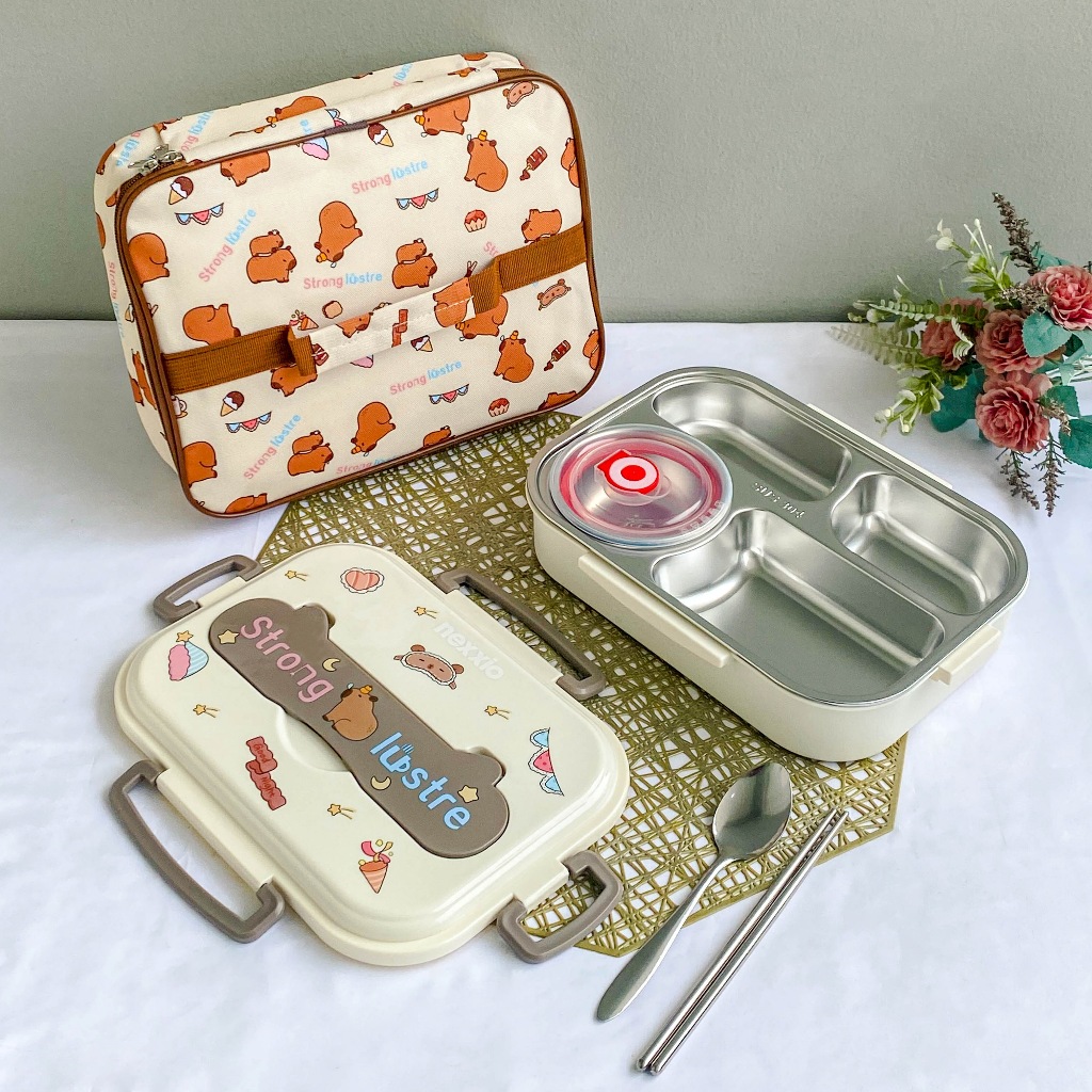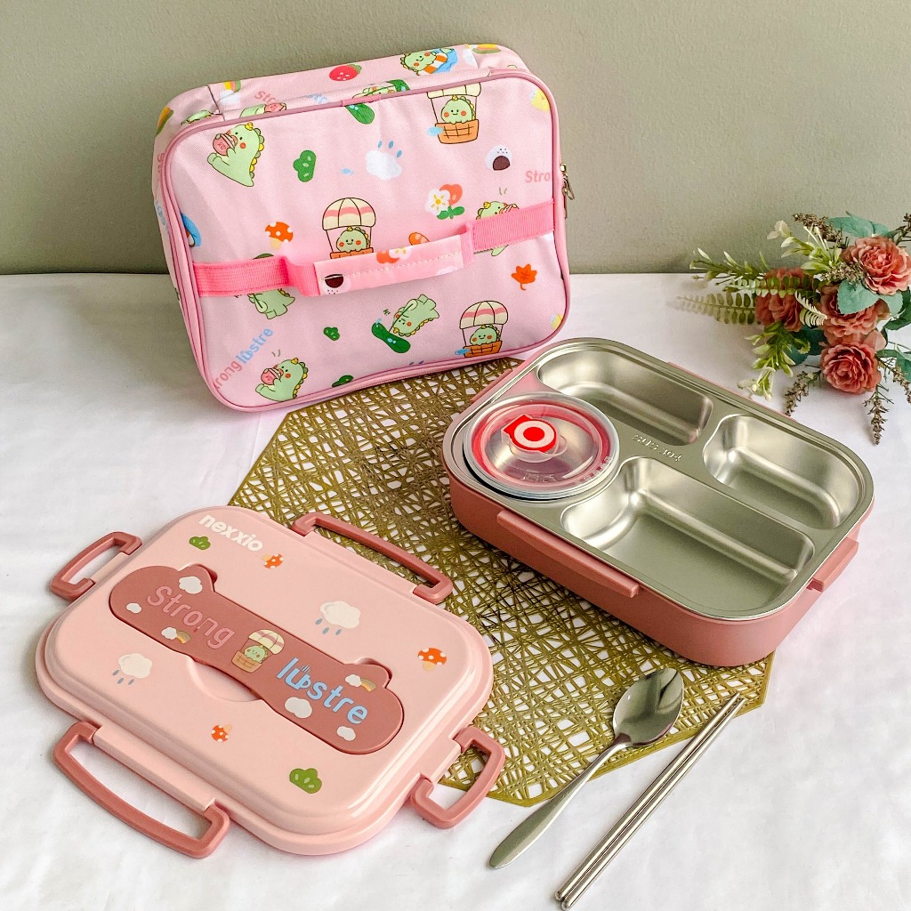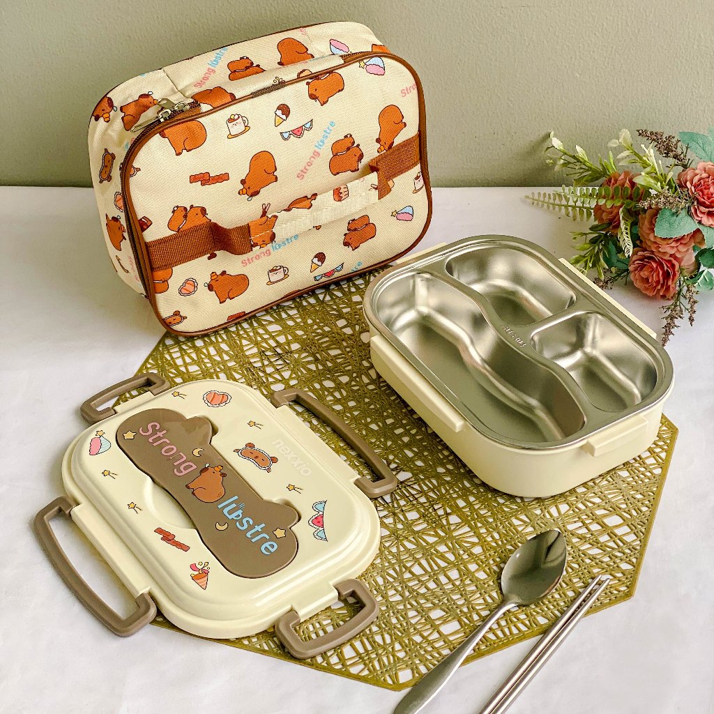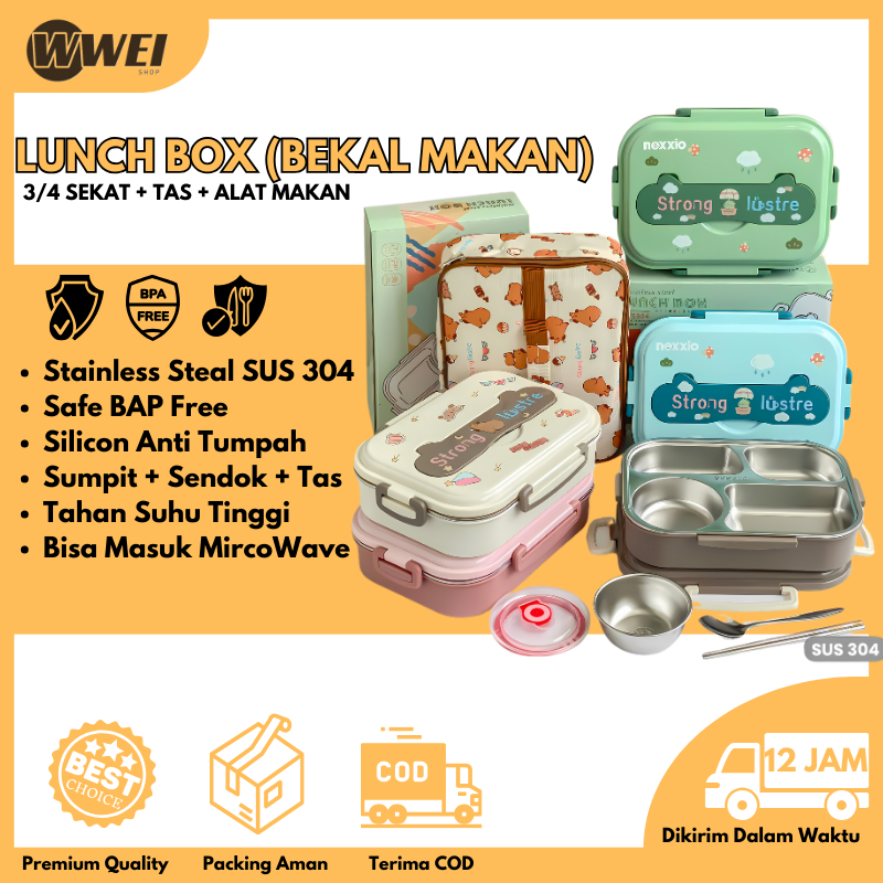WweiShop Lunch Box Kotak Makan 3 Sekat 4 Sekat Stainless Steel / Set Alat Makan Anak Stainless / Kotak Makan Stainless Anak / Lunch Box Anti Tumpah Anak