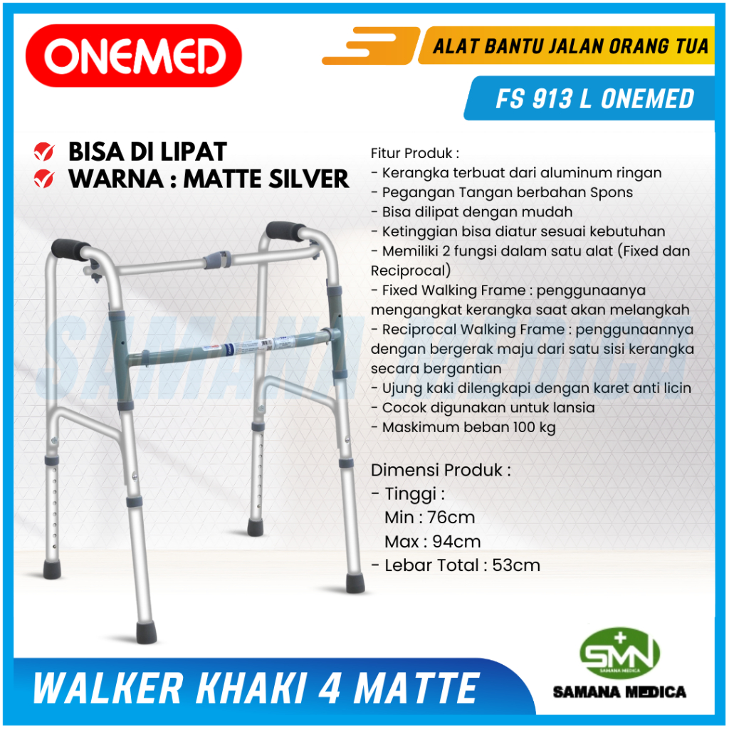 Walker Lansia Merk ONEMED FS913L - Matte Silver - Alat Bantu Jalan Walker Tanpa Roda / Dengan Roda Lebih Kuat Kokoh