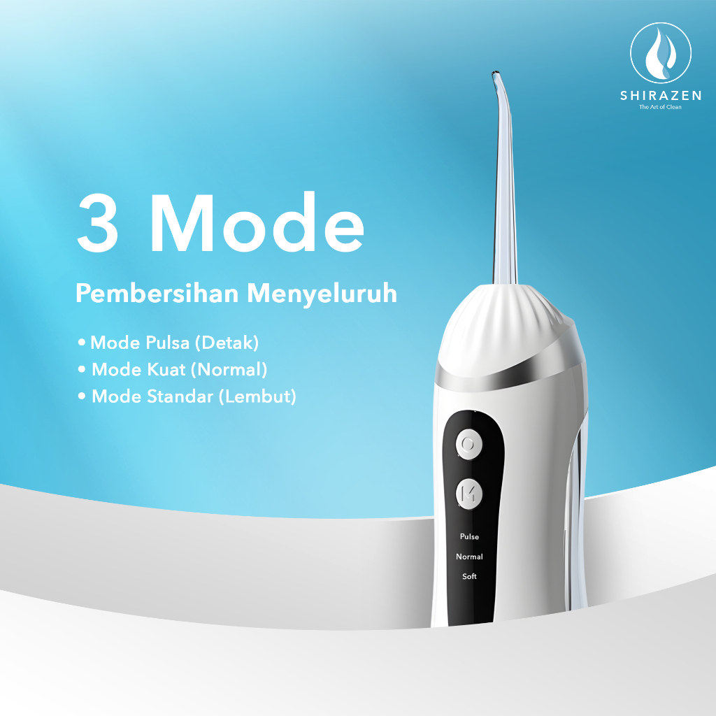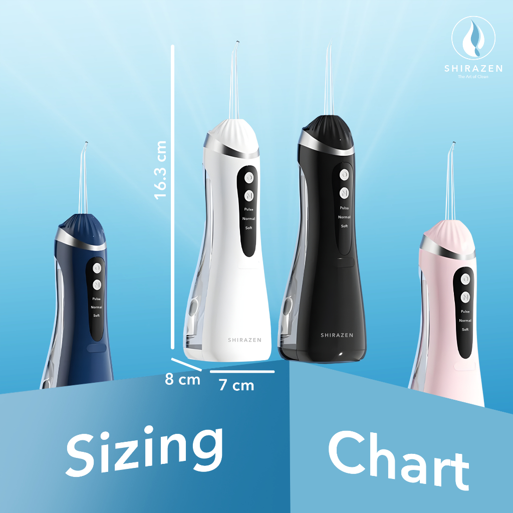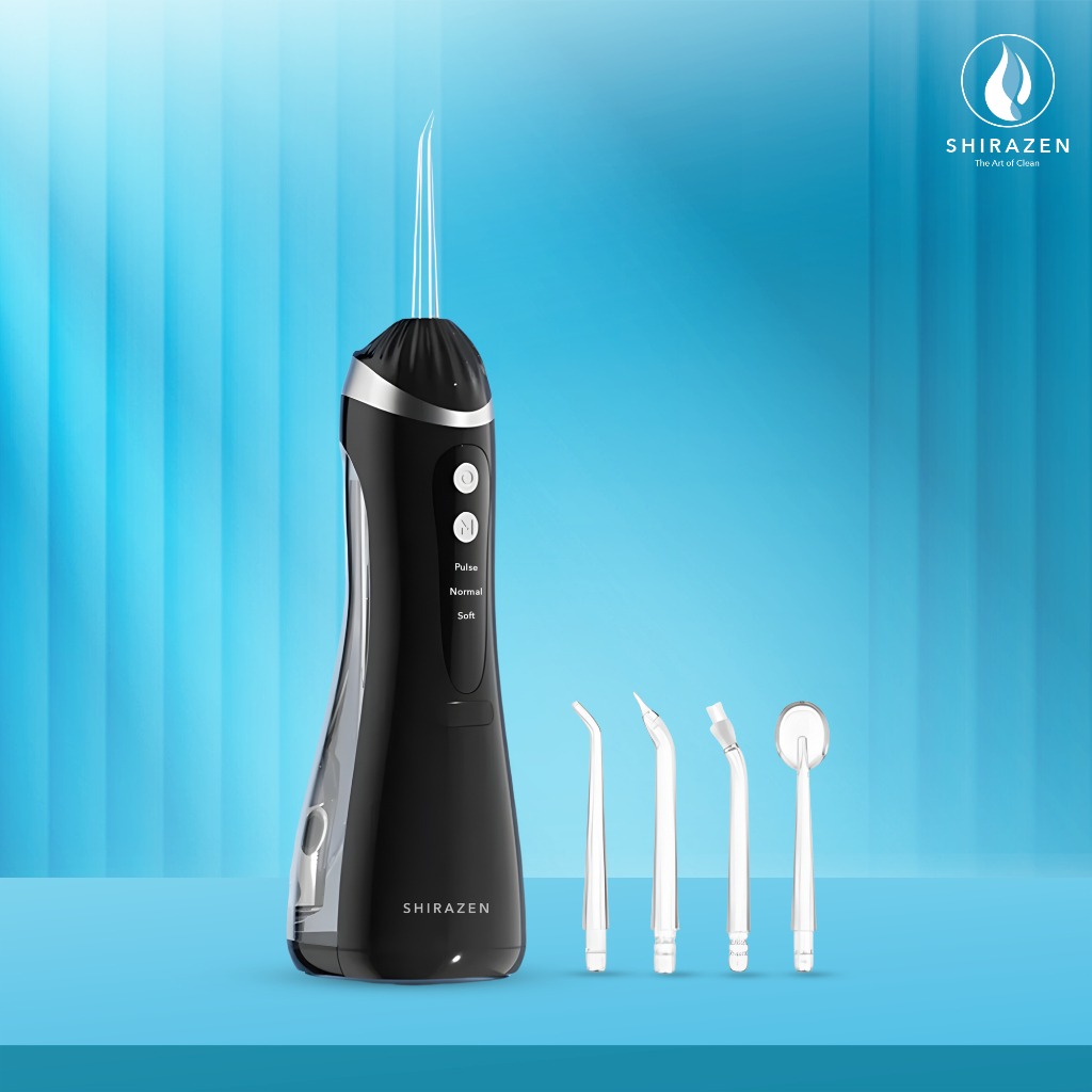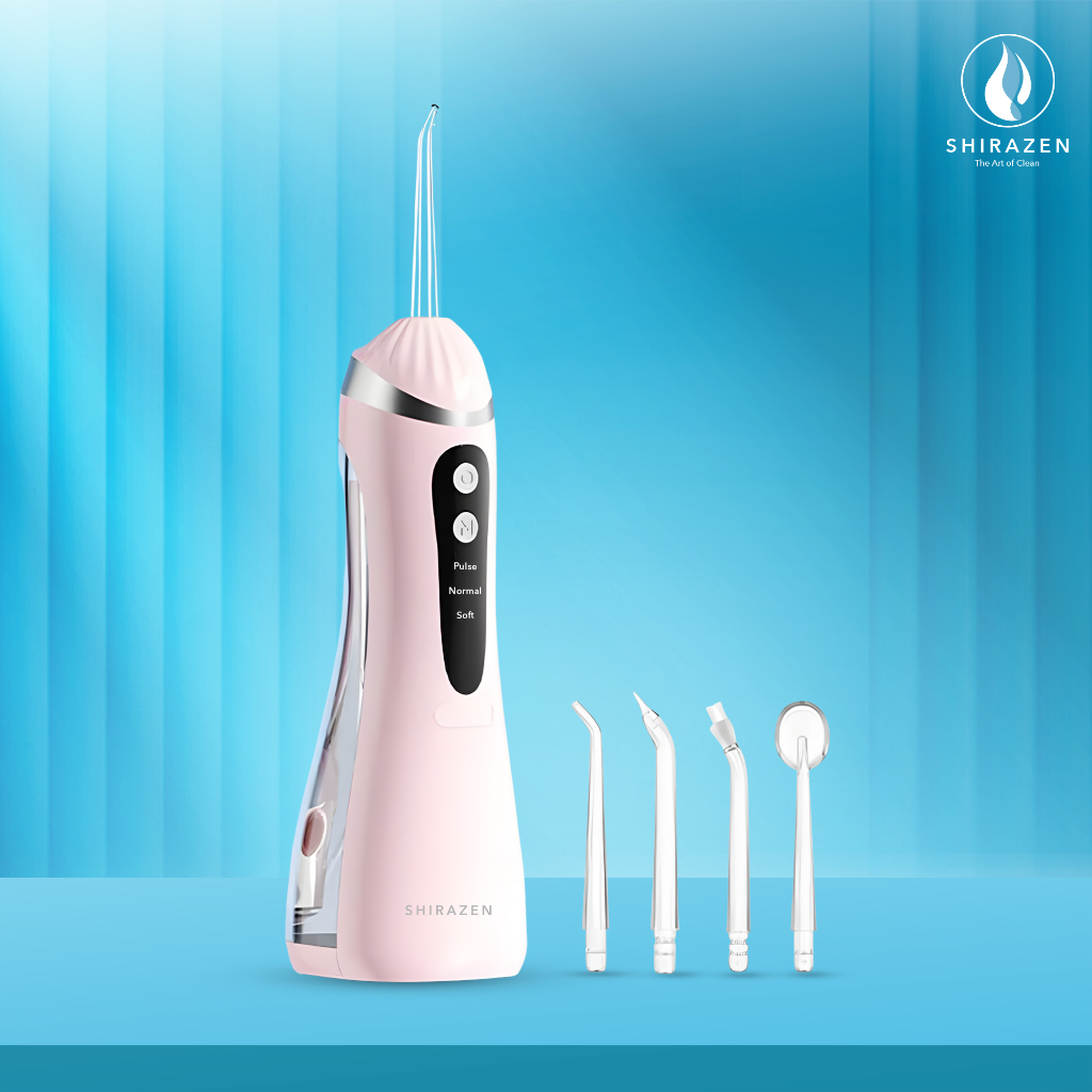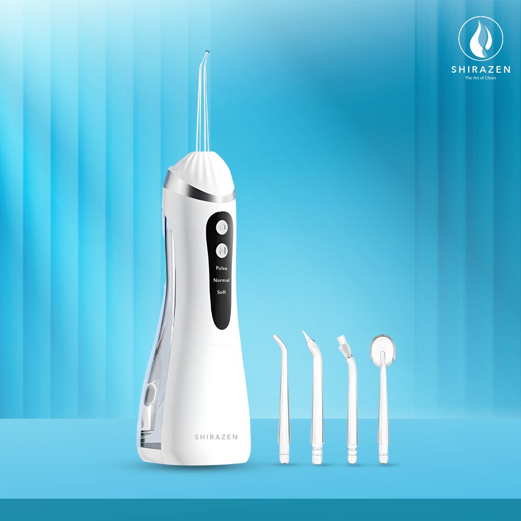 Shirazen Electric Water Flosser A16 Elektrik Oral Irrigator Pembersih Gigi Plak Karang Nirkabel Portable IPX7 Tahan Air Pulse 1600 Piston Pump 3 Mode 4 Nozel Ortodontik