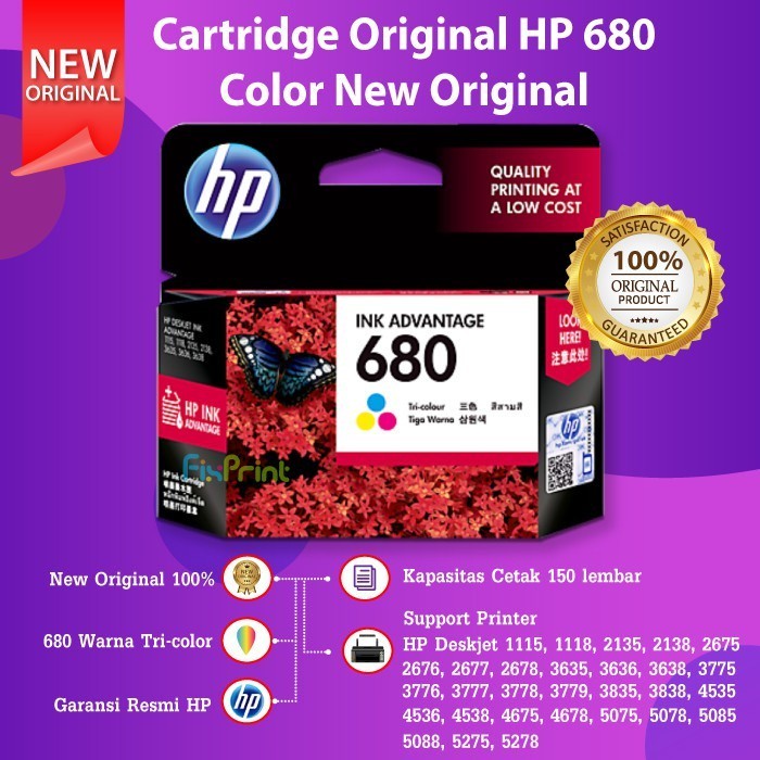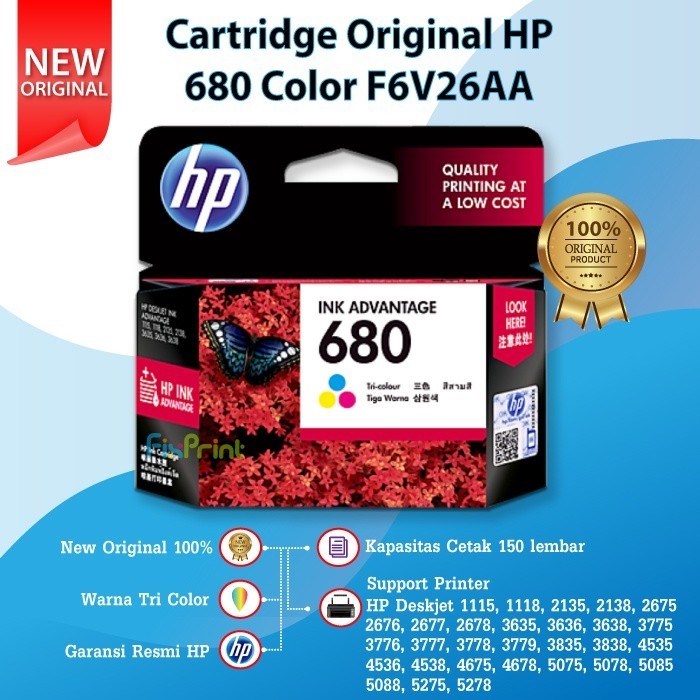 Cartridge Tinta HP 680 Color F6V26AA Printer 1115 2135 2676 3775 4535 4675 5275 Black Color Original