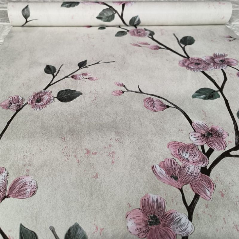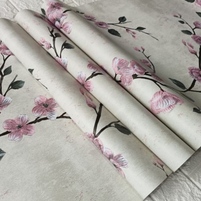 Wallpaper Sticker Dinding Motif Bunga Sakura Dasar Putih Gading Bunga Pink Dekorasi Dinding Ruang Tamu Kamar Tidur Mewah Elegan Premium Kekinian