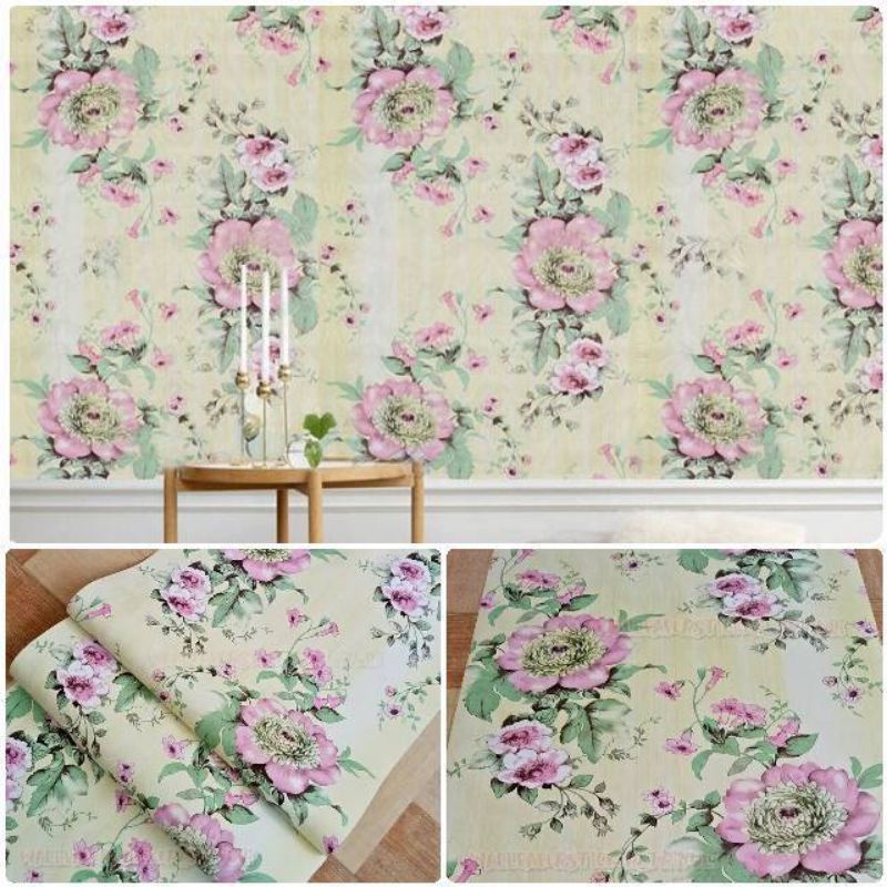 Wallpaper Stiker Dinding Warna Dasar Krem Motif Bunga Mawar Pink Mewah Elegan Premium Modern