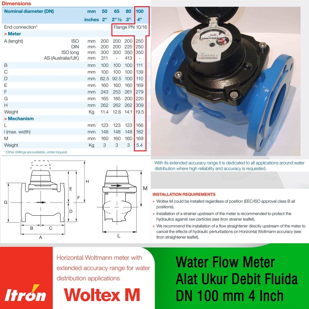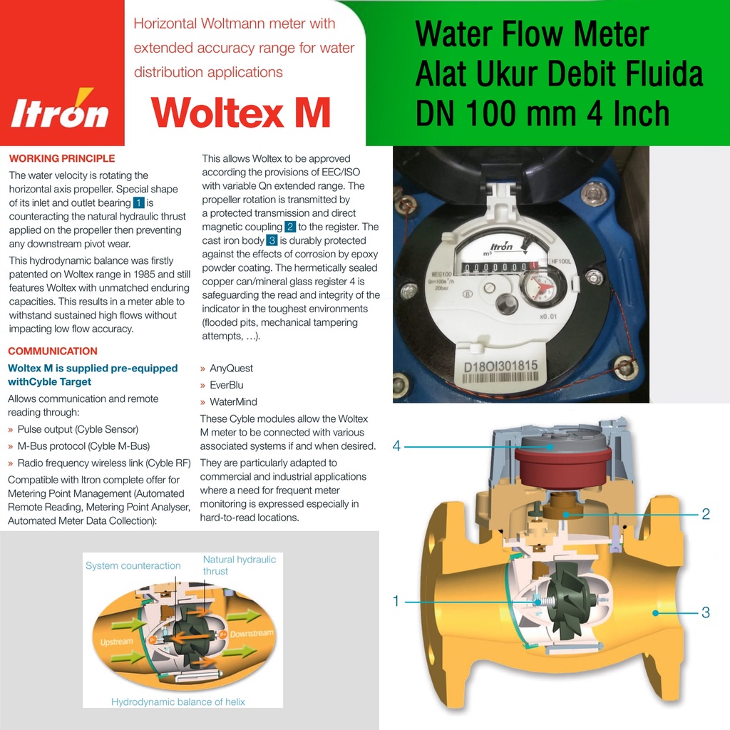 Water Flow Meter Alat Ukur Debit Fluida Aliran Air Itron Woltex M 4 Inch DN 100 mm