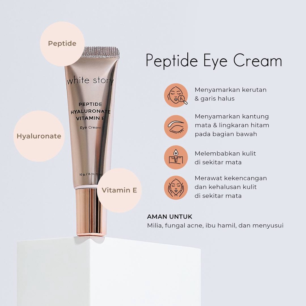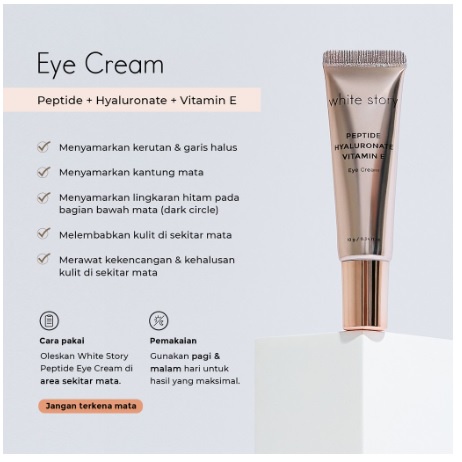 White Story Peptide Eye Cream Peptide (Dipeptide & Acetyl Tetrapeptide) + Hyaluronate + Vitamin E Kerutan & garis halus di sekitar mata Kantung mata Dark circle White Story Peptide Eye Cream White Story Peptide Eye Cream