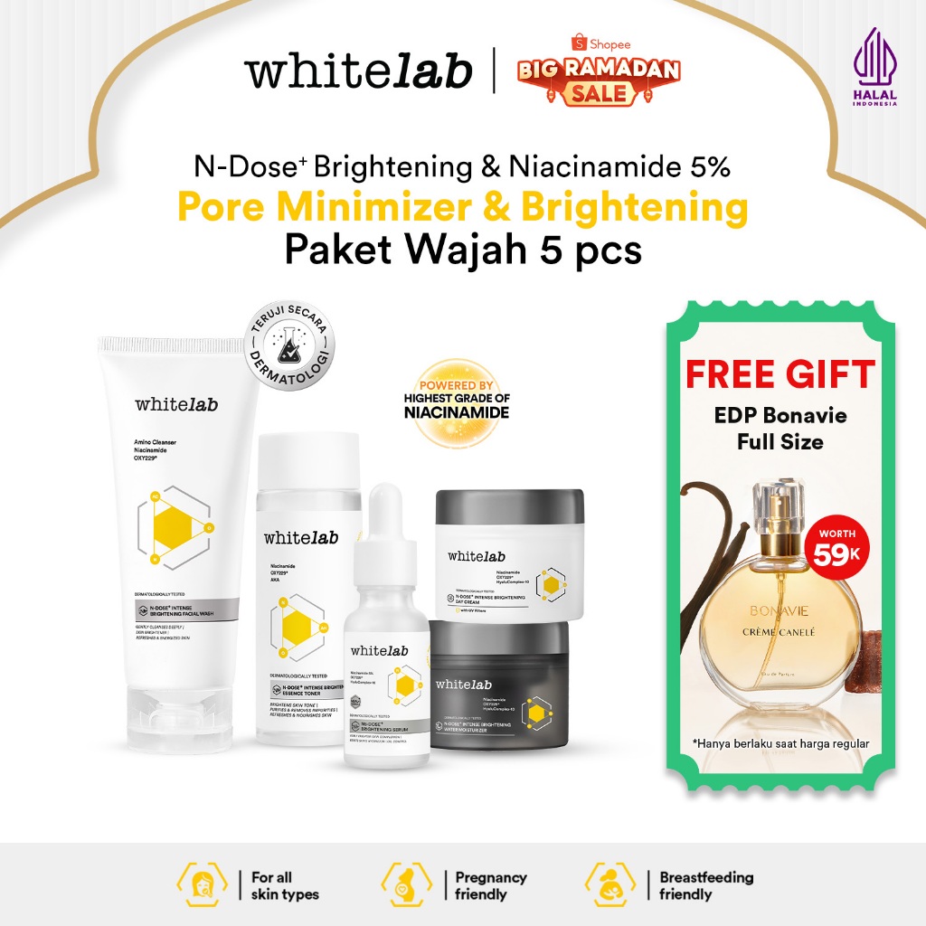 Whitelab Paket Wajah Brightening Niacinamide Facial Wash, Toner, Serum, Day & Night Moisturizer - 5 pcs N-Dose+ 2.0 Skincare