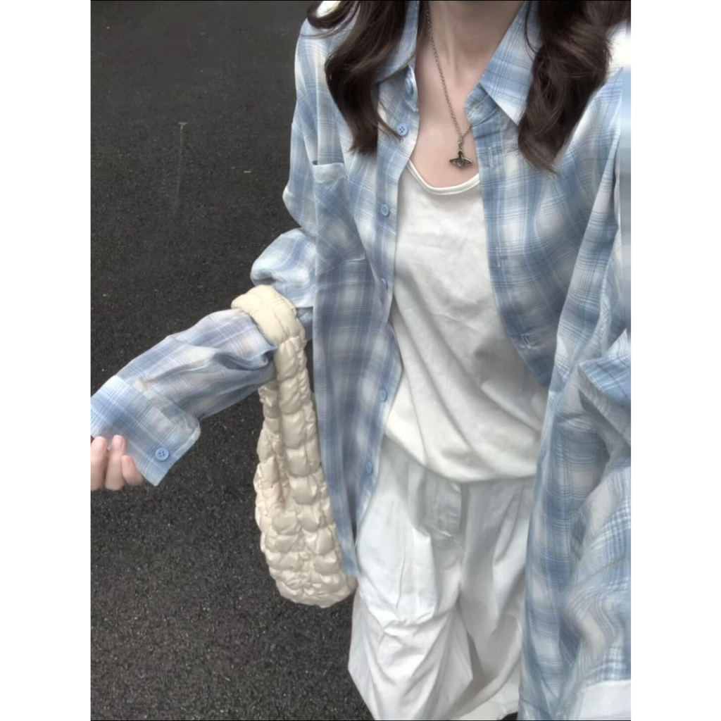 2TOYOUNG blouse wanita Kemeja Kotak-kotak Biru Wanita Longgar Korea Biru dan Putih Kemeja Lengan Panjang
