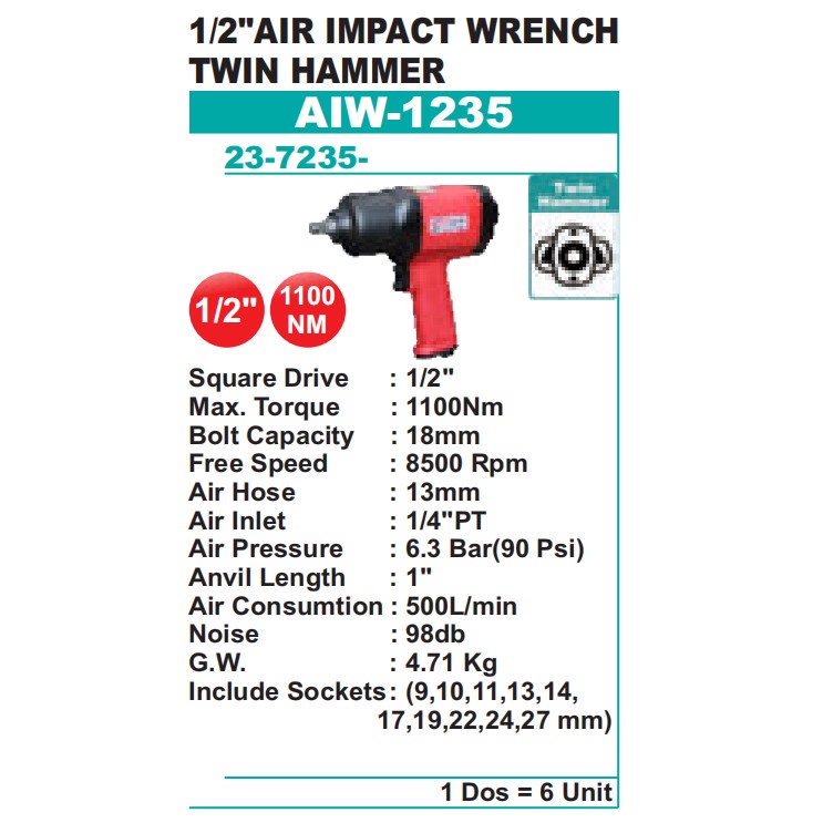 Wipro AIW 1235 Air Impact Wrench 1/2" 18mm Twin Hammer Torque 1100nm AIW1235