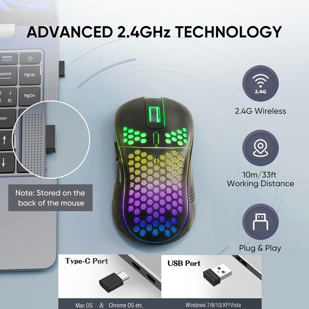 Wireless Gaming Mouse Honeycomb 2.4G USB & Type-C Mice RGB Rechargeable Adjustable DPI Mouse for PC Laptop Windows Android