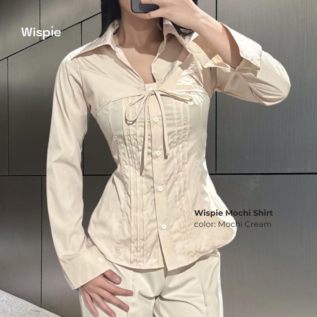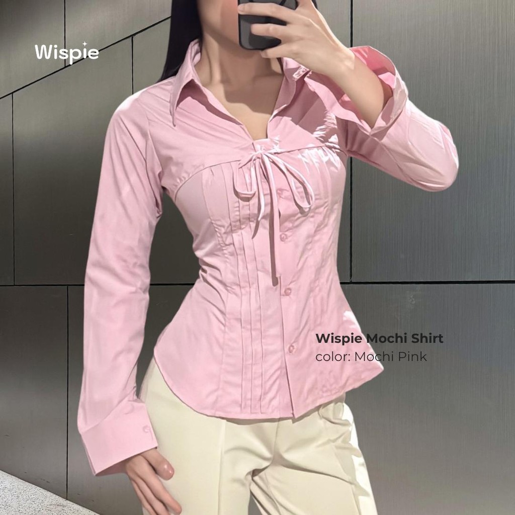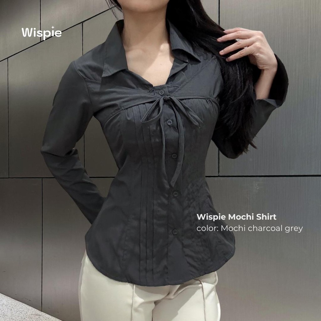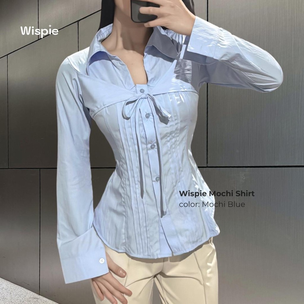 Wispie Mochi Shirt | Kemeja Wanita Lengan Panjang Tali Pita Slim Fit Soft Touch Parachute Blue Pink Cream Grey