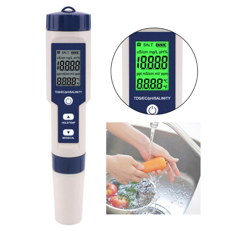 Multifungsi 5 in 1 Pena/Pengukur Digital Kualitas Air dengan Monitor Salinitas, dan Termometer untuk Akuarium, Air Minum, dan Kolam Ren PPM /temperature meter digital Water Quality Tester Peng PH/TDS/EC/ORP/SG/Salinity