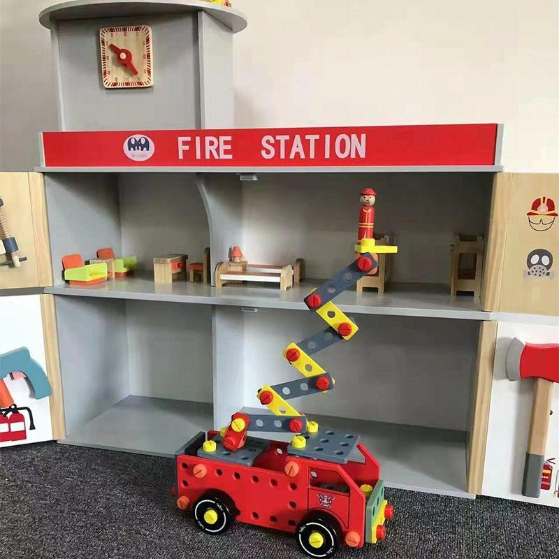 Wooden Fire Station Doll House Toy Fire Truck Multifunction Tool Boy Play House