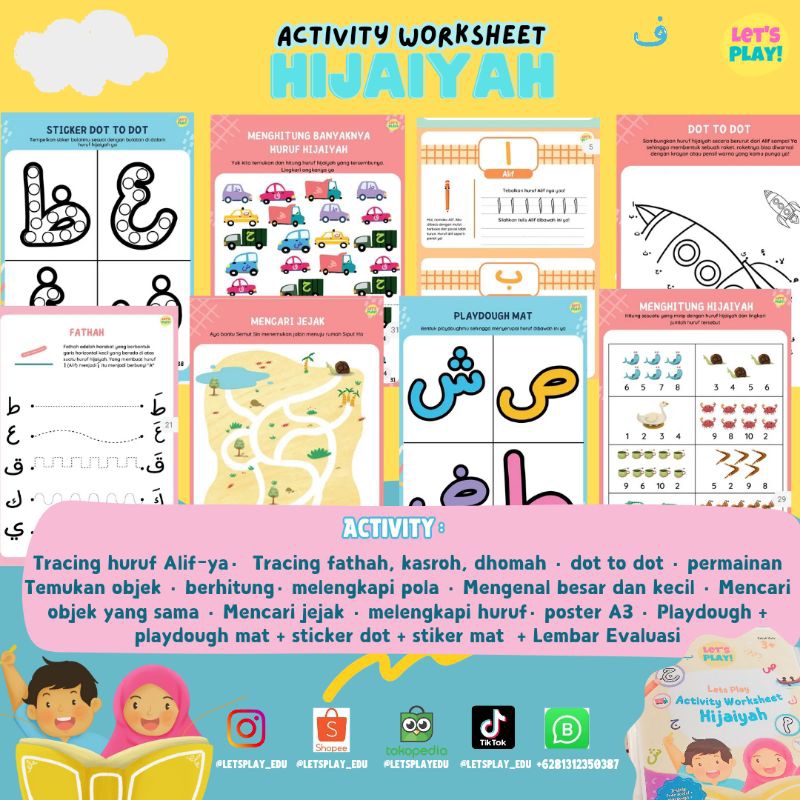 Worksheet huruf hijaiyah islami Lets Play dengan aktivitas sensory play free playdough stiker dot dan poster A3 belajar ngaji belajar iqro alif ba ta