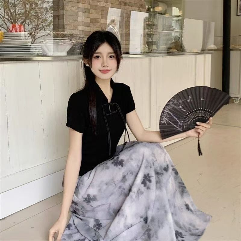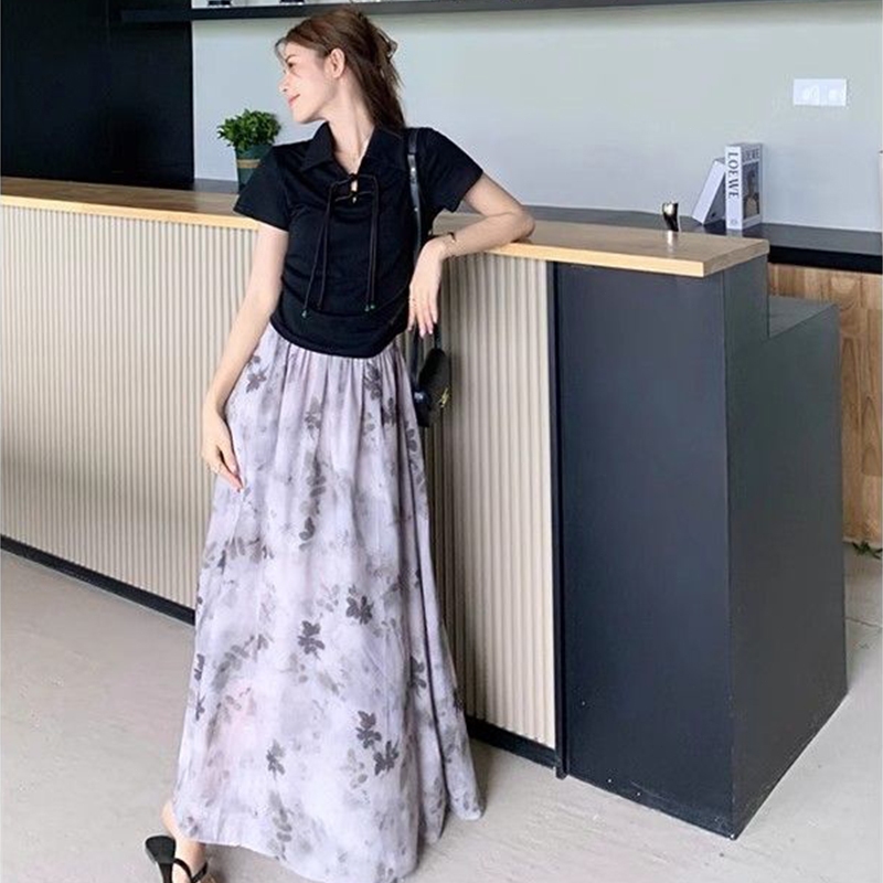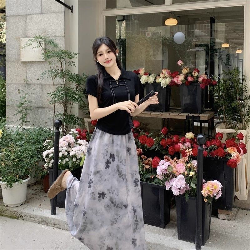 Yi Ya You - Dress china Elegan Kasual Perpaduan Atasan Hitam dan Rok Flowly Motif Awan - dress elegan floral dress dres panjang K054Ya You Dress Kasual