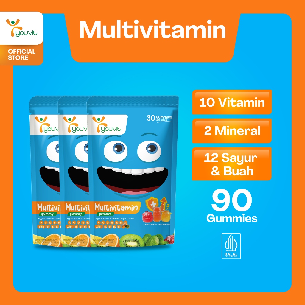 Multivitamin Gummy Anak untuk Tumbuh Kembang dan Imunitas Anak | Youvit Multivitamin Anak 90 Hari (3 Pouch) dengan Vitamin C, Vitamin D, Zink, Sayur, dan Buah