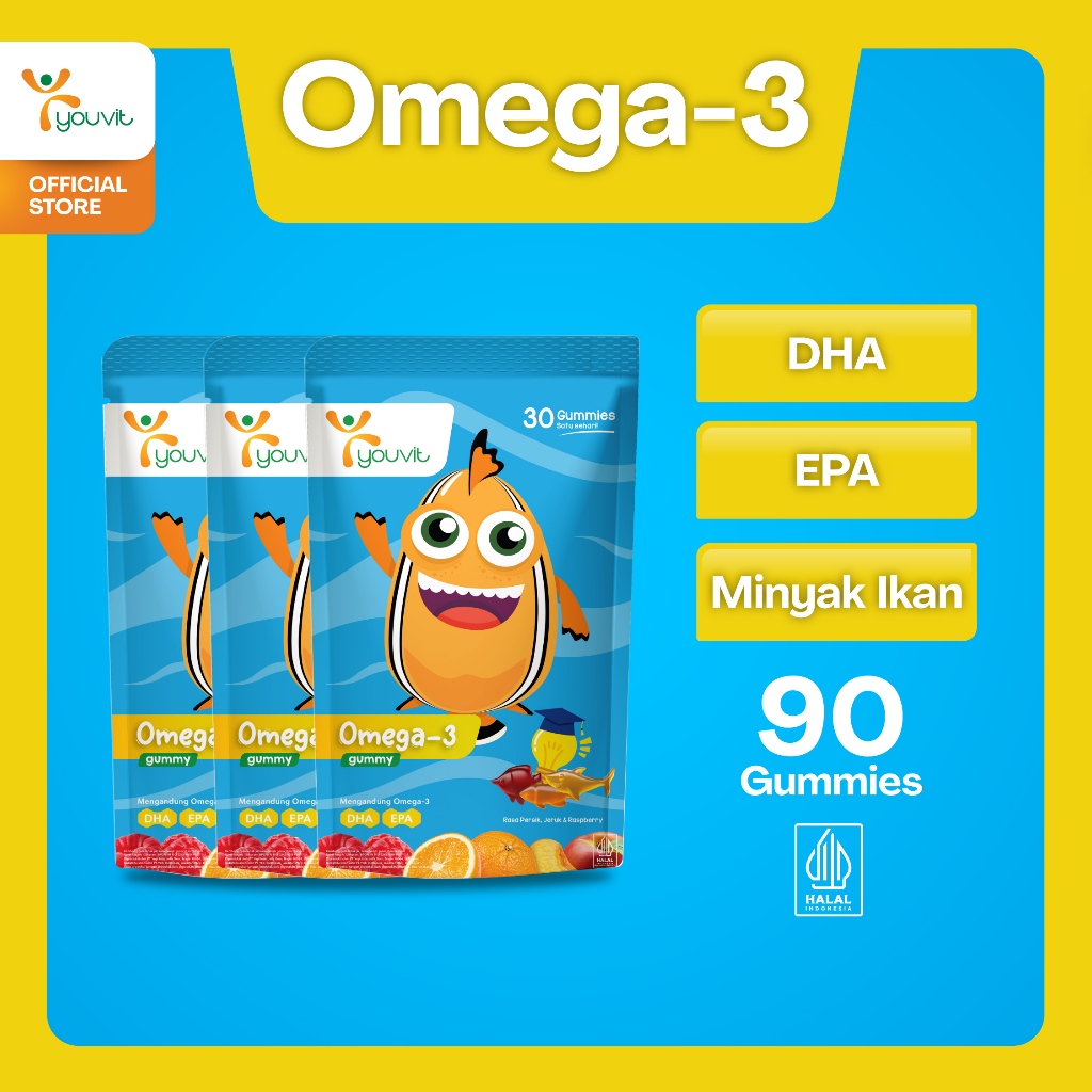 Youvit Omega 3 Anak 3 Pouch (90 Hari) dengan Minyak Ikan untuk Vitamin Otak & Mata Anak (Vitamin Otak Anak) | Rasa Enak Tidak Amis | Dukung Fokus, Konsentrasi & Daya Ingat Anak