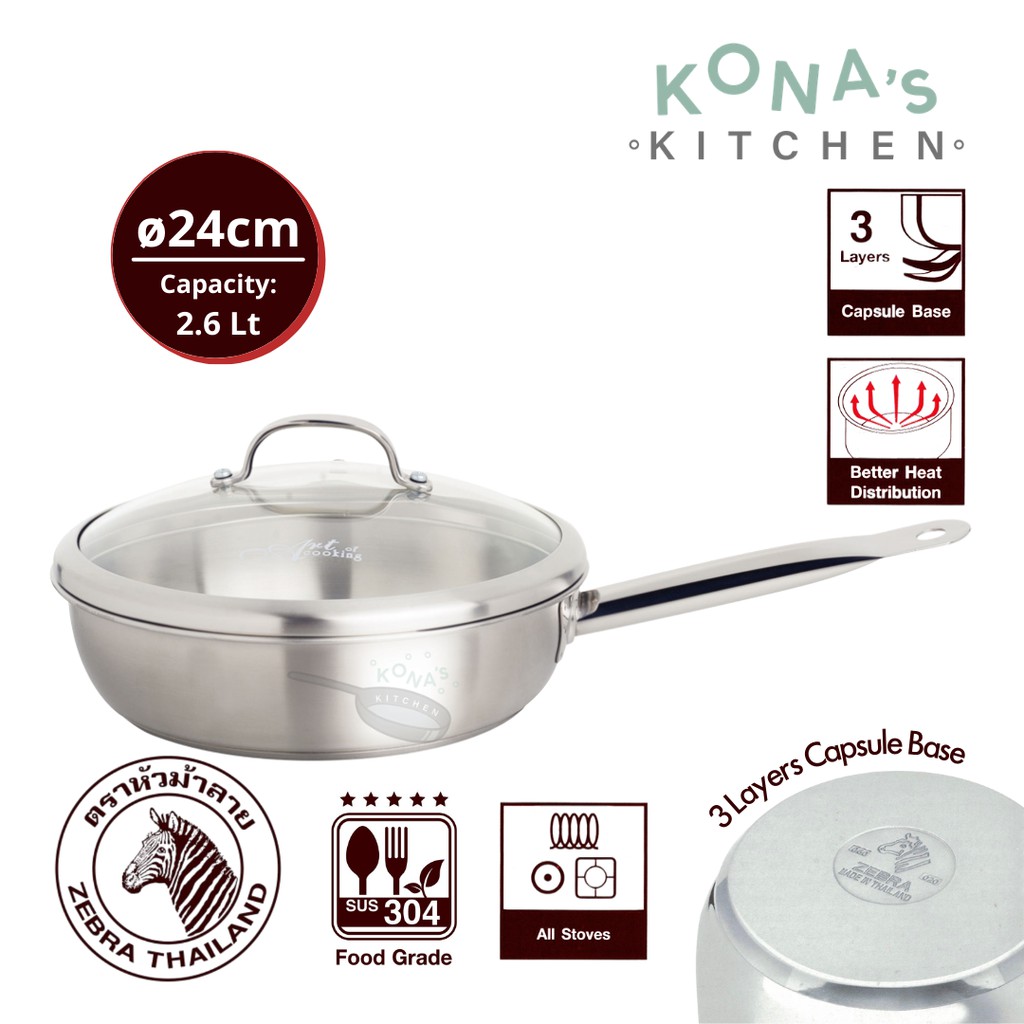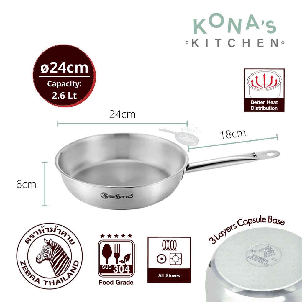 Zebra Frying Pan 24 CM W/Glass Lid Estio Pro (175102) / Wajan Penggorengan Stainless SUS304