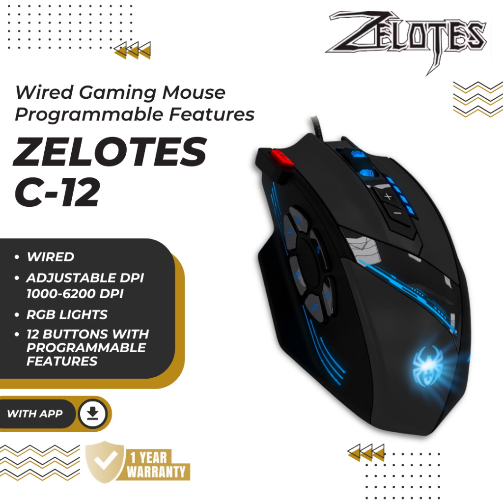 Zelotes C12 Wired Gaming Macro Mouse Programmable 12 Button 6200 DPI 4 Level With Apps