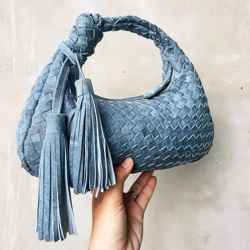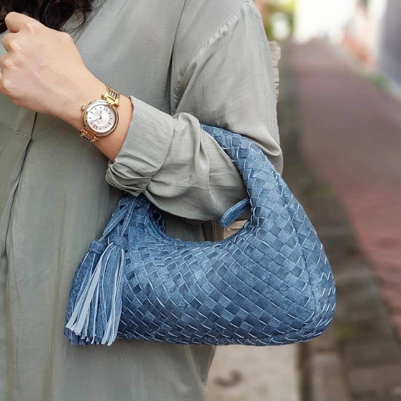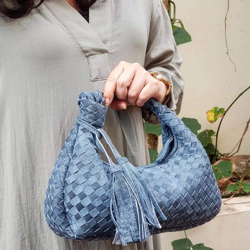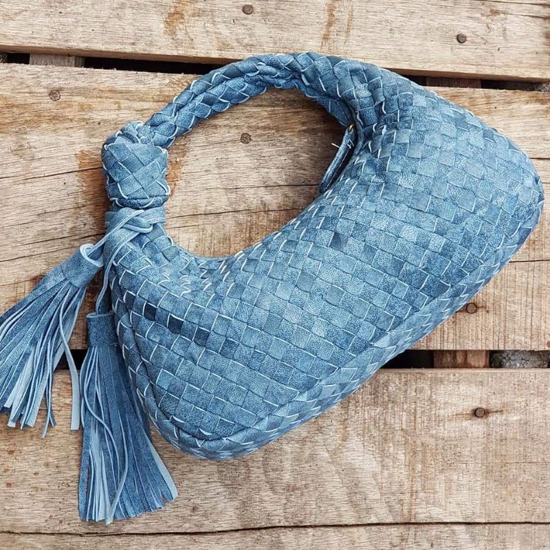 bottega kulit asli small ikat tebal + Tassel kulit domba biru antiq