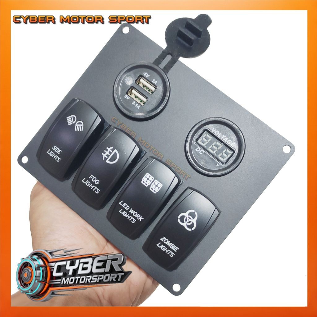 dashboard panel mobil instrument 4 saklar volt meter dc socket 12 volt 24 volt. Switch on off sakelar 4 gang mobil racing offroad klassic car Bus truk perahu kapal dll biled headlamp foglamp drl led bar audio sound bracket 42c skun kabel