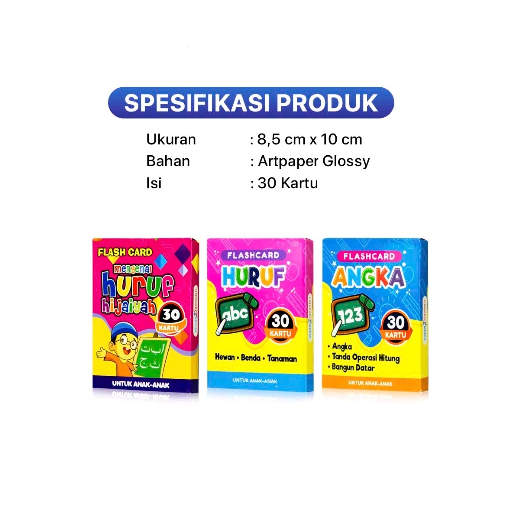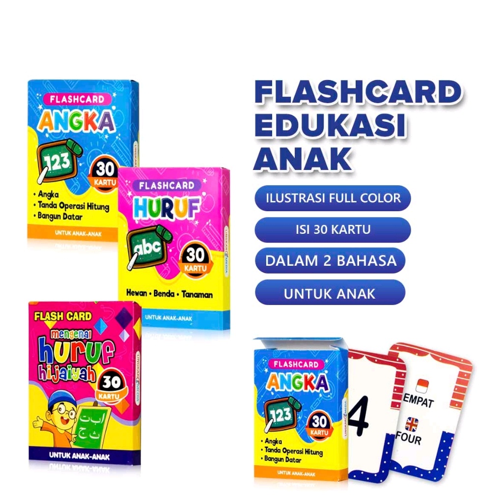 flash card Angka 1 2 3 Isi 30 Kartu / Huruf ABC Isi 30 Kartu / Mengenal Huruf Hijaiyah Isi 30 Kartu