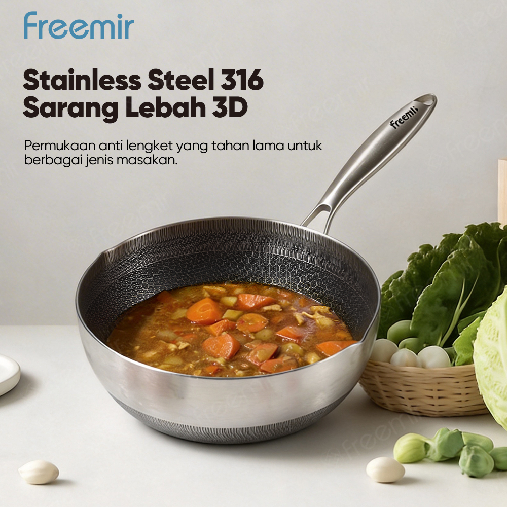 freemir Tiga Lapis 316 Motif Sarang Lebah dengan Tutup Kaca 24cm Anti Lengket Luar Dalam Panci stainless steel