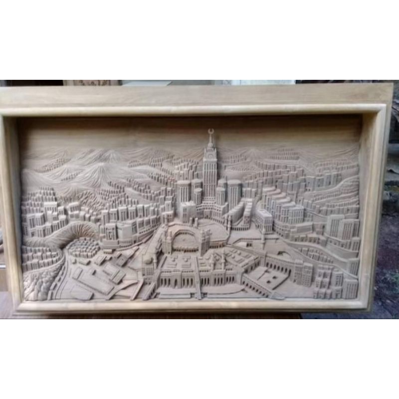 hiasan dinding ukiran 3 dimensi relief 3d landscape masjidil haram mekah kaligrafi ukiran kayu jati