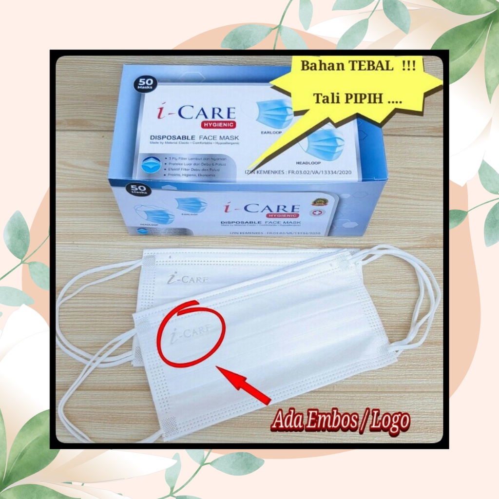 i Care One Care Masker 3 Ply Putih Hijau Disposable Face Mask Earloop