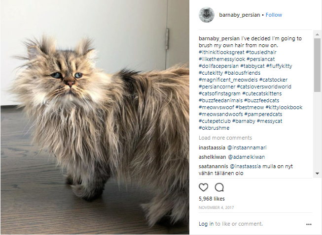 Terkenal dengan captionnya yang komunikatif, Barnaby menjadi favorit netizen karena seolah mereka sedang mengamati si kucing ini menceritakan kesehariannya alias curhat.