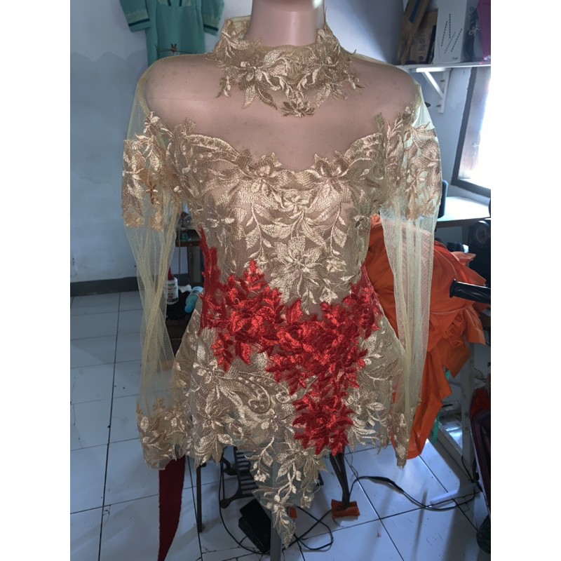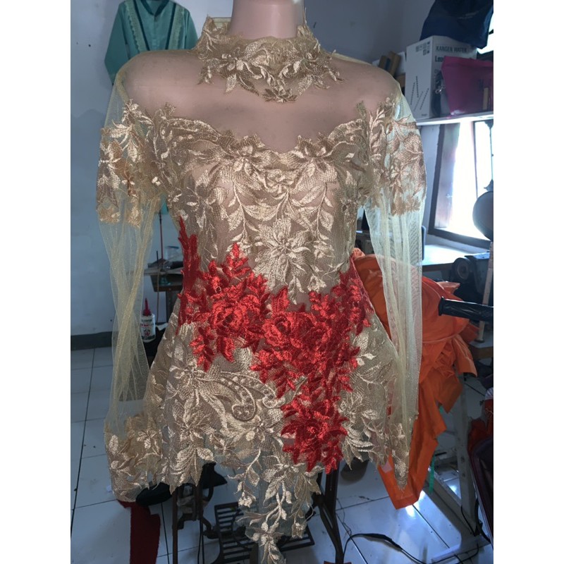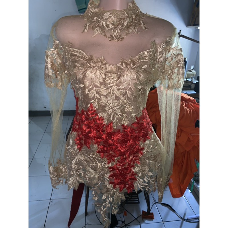 kebaya wisuda warna gold kombinasi merah