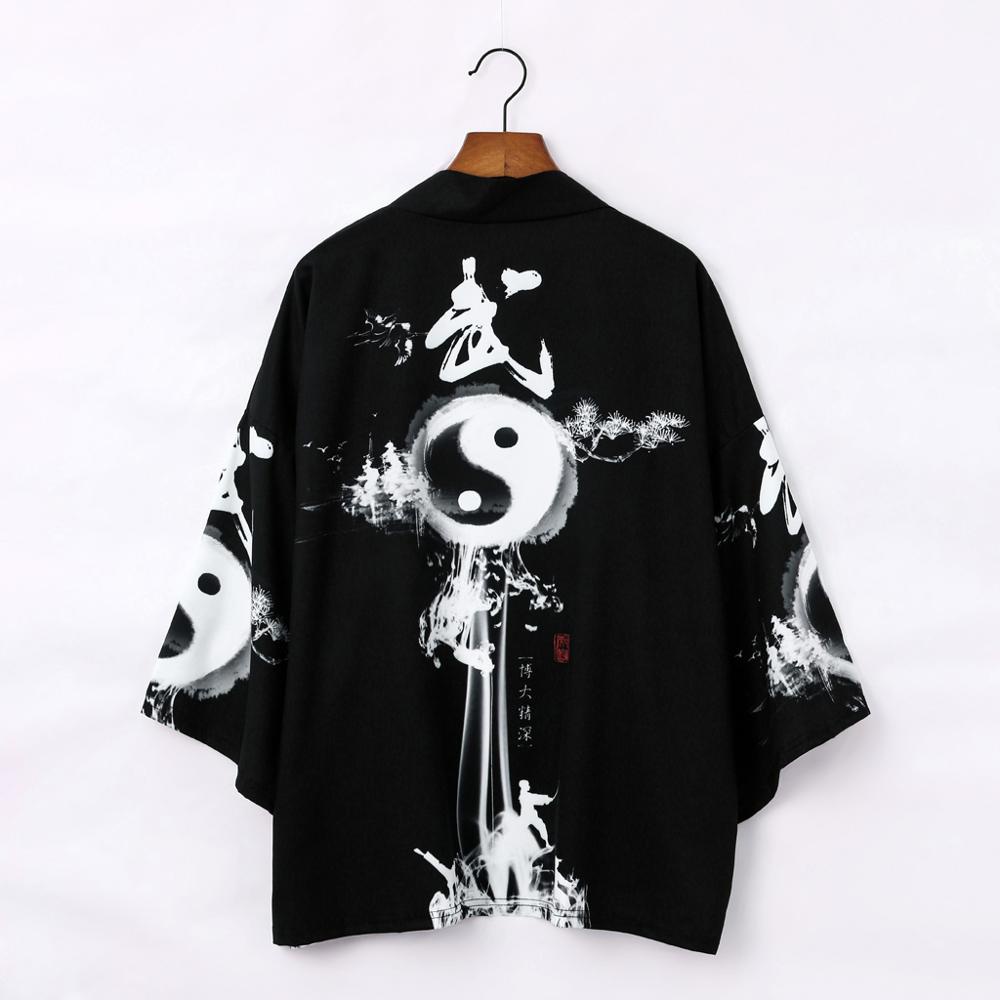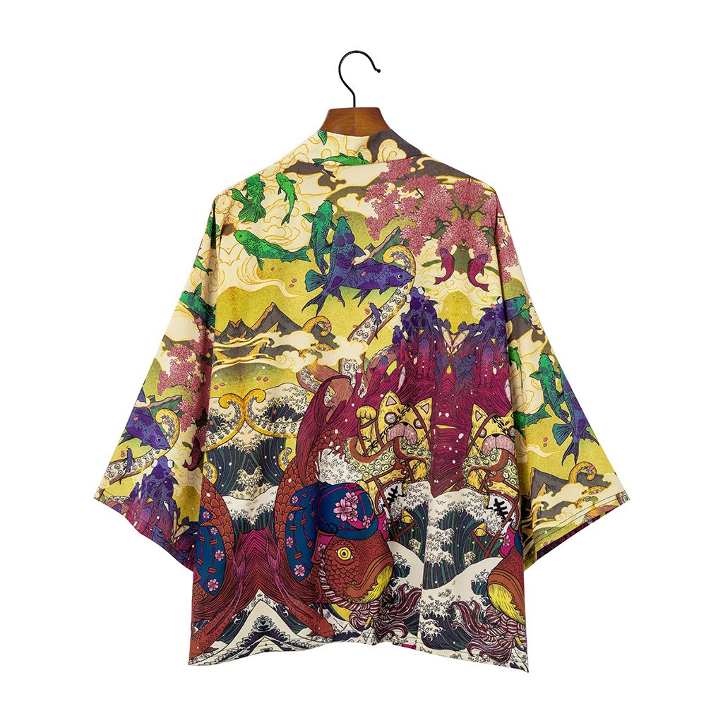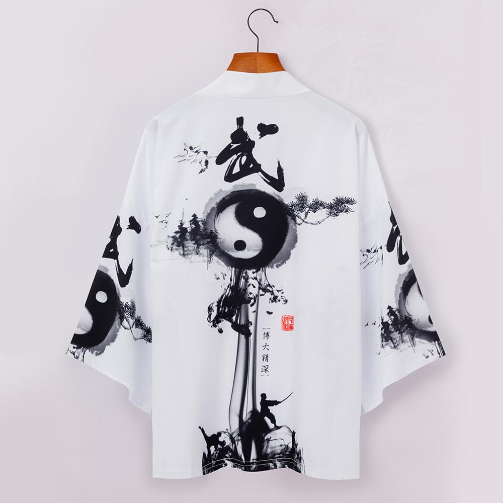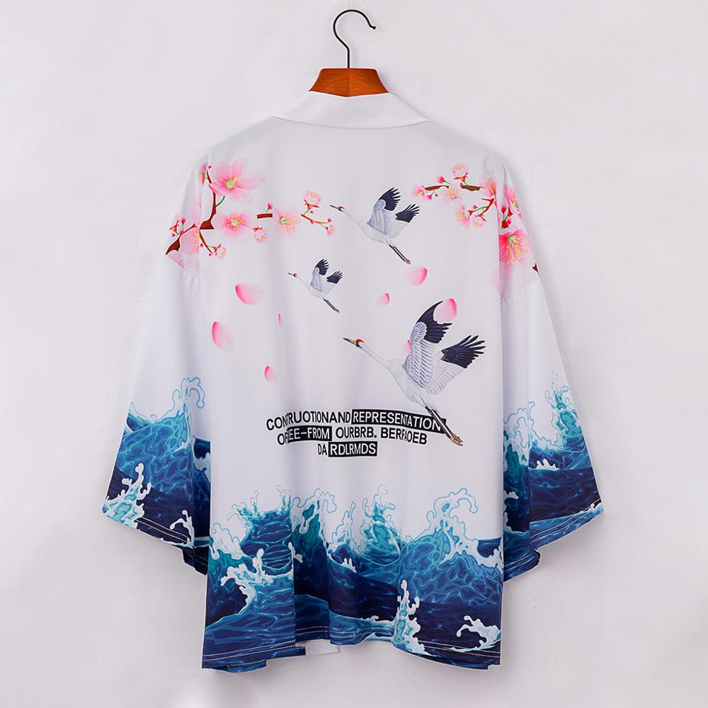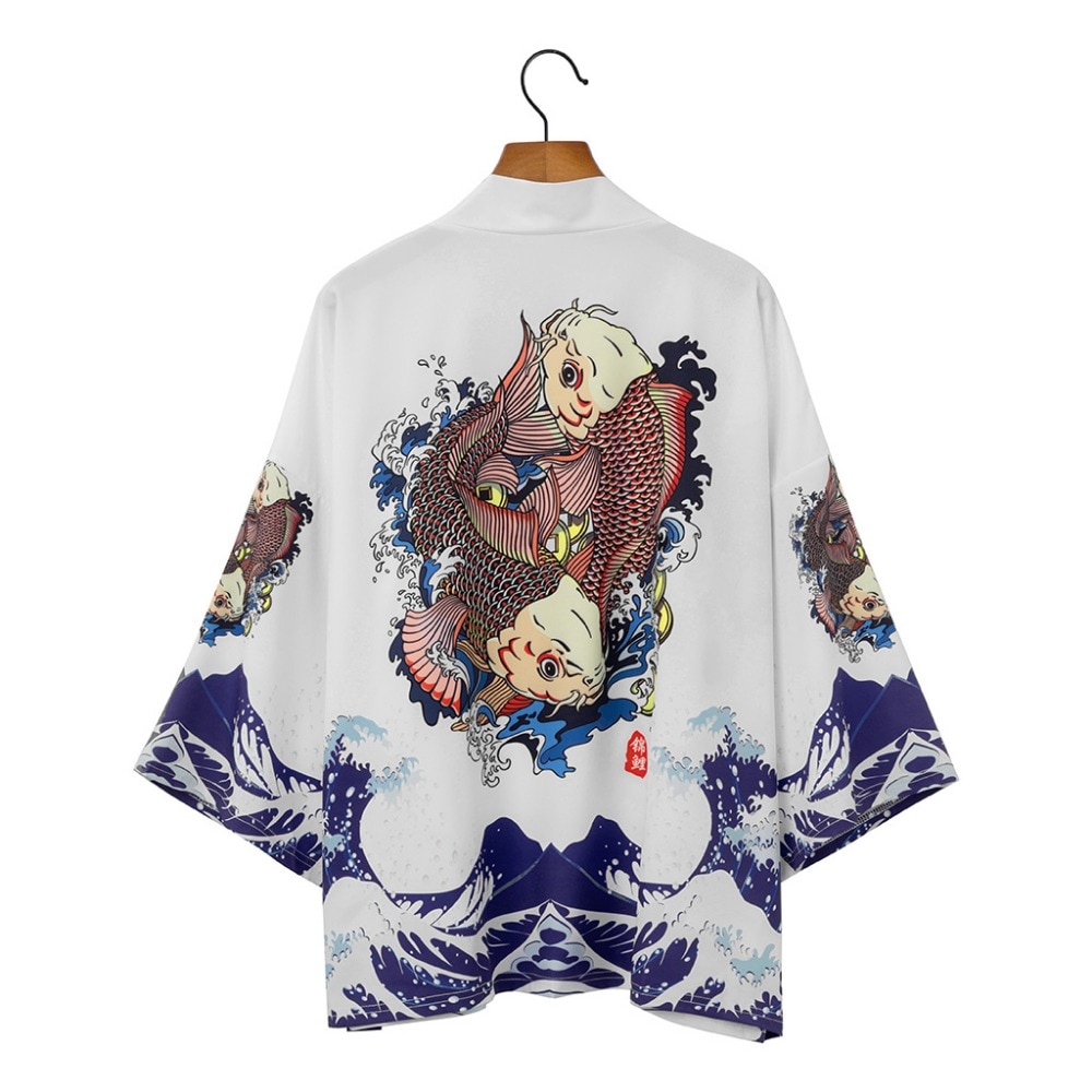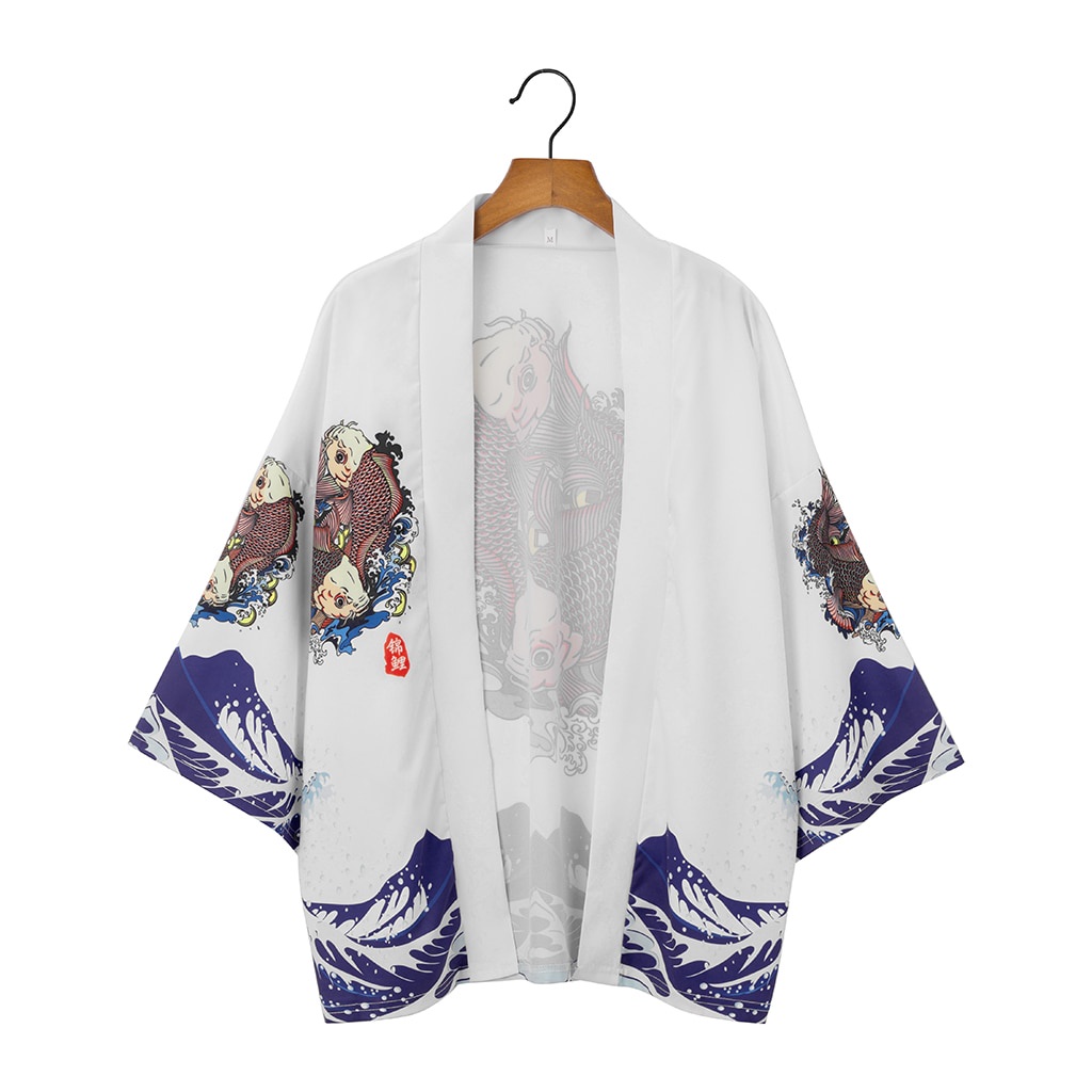 kimono outher kimono cowok Kimono Pria Jepang Motif Gelombang Ikan Mas Putih Obi Cardigan Pakaian Tradisional Jepang Yukata Haori tradisional keren jumbo