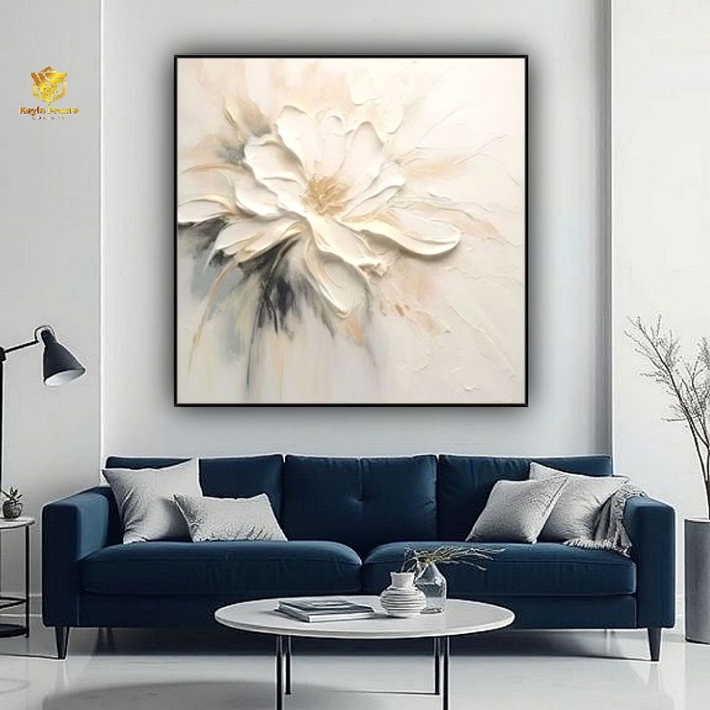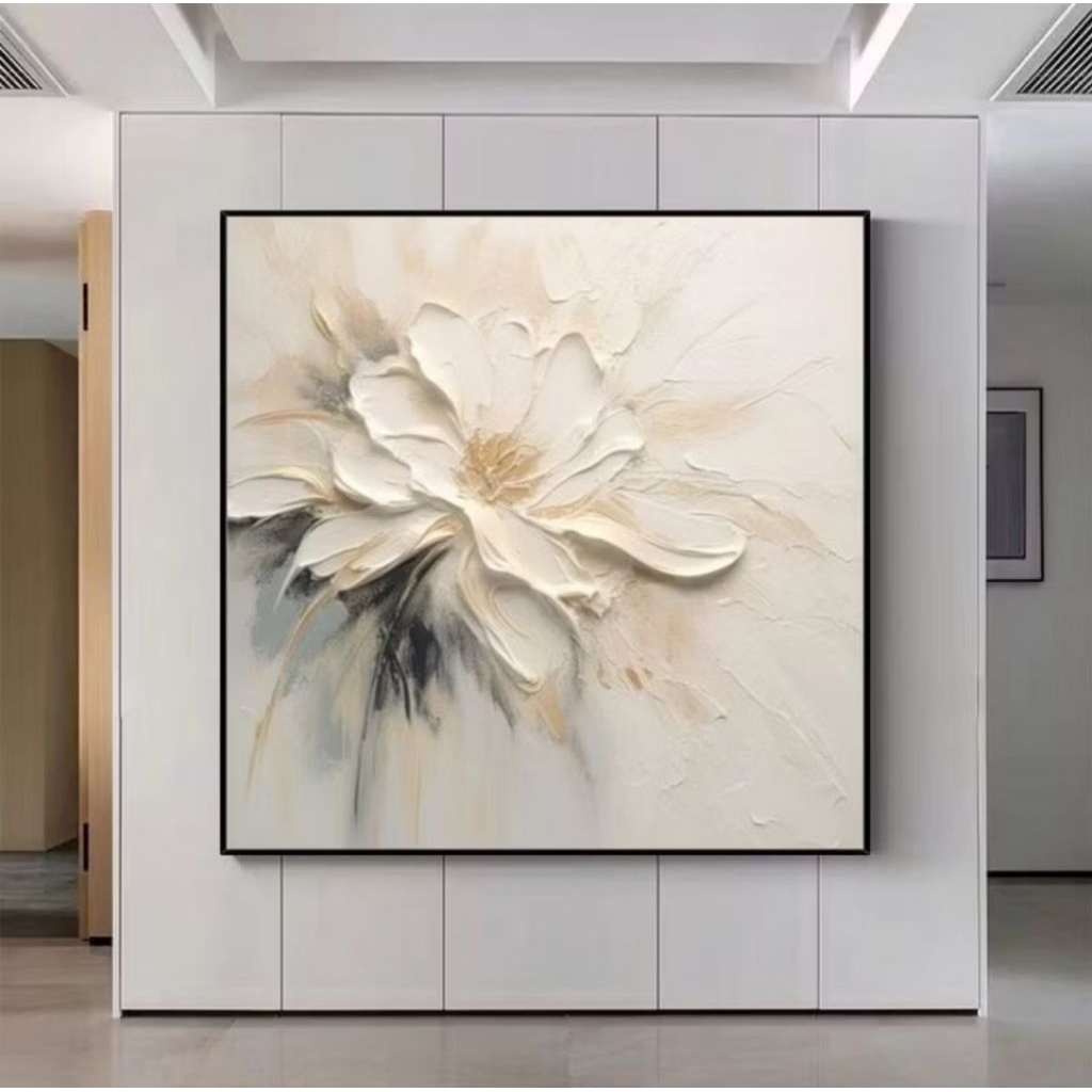 Lukisan Kanvas Abstrak Bunga Putih Teksture Minimalis Art Modern Wall Decor Ruang Tamu - Hand Painted Premium - Frame Minimalis - Dekorasi Kantor & Hotel - Custom Tema - Home Decor - Dekorasi Dinding