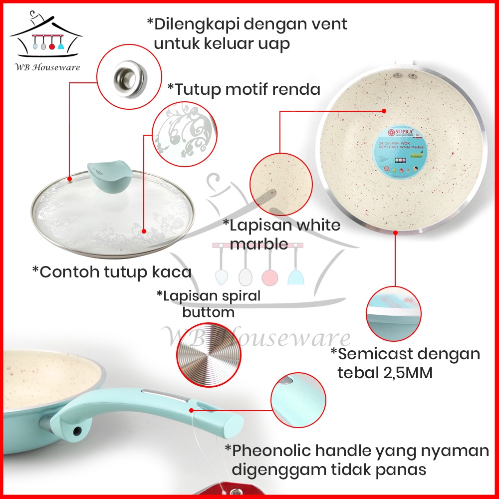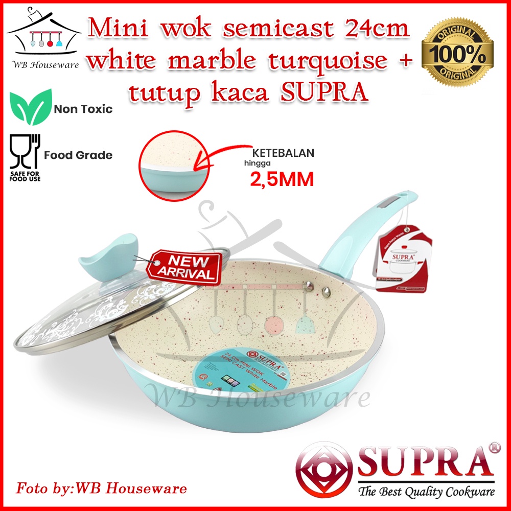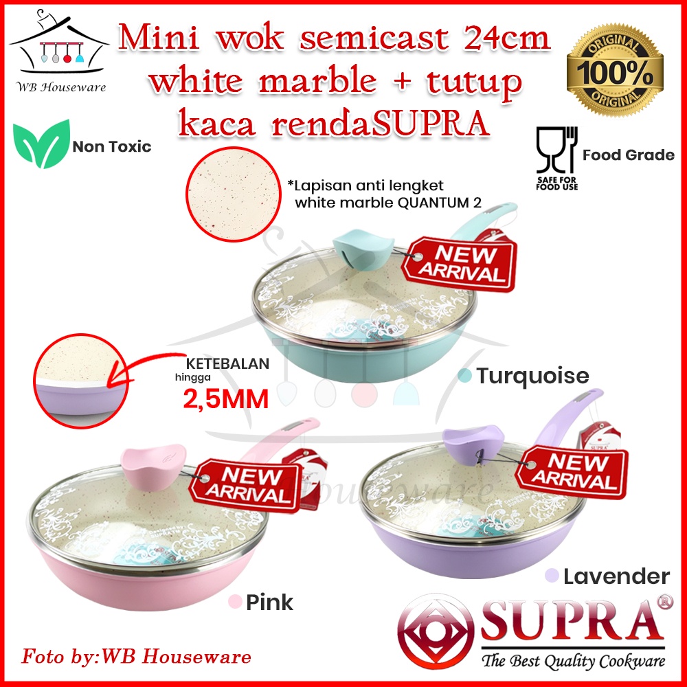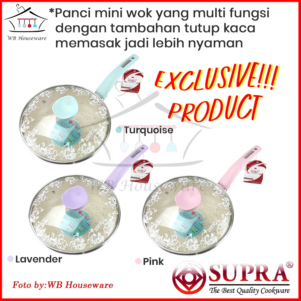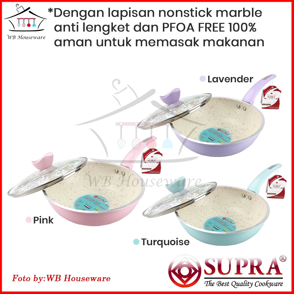 mini wok 24 cm supra white marble anti lengket + tutup kaca / panci supra pastel series