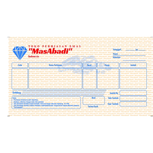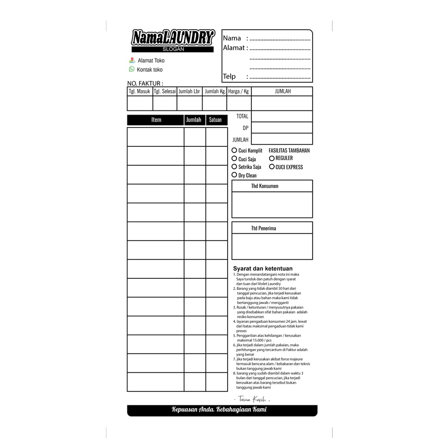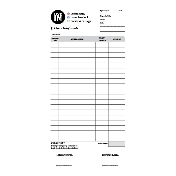 nota, ataupun kwitansi ukuran 1/3 folio custom (10 x 20 cm) Custom : Logo, Nama , cp, sosmed warna