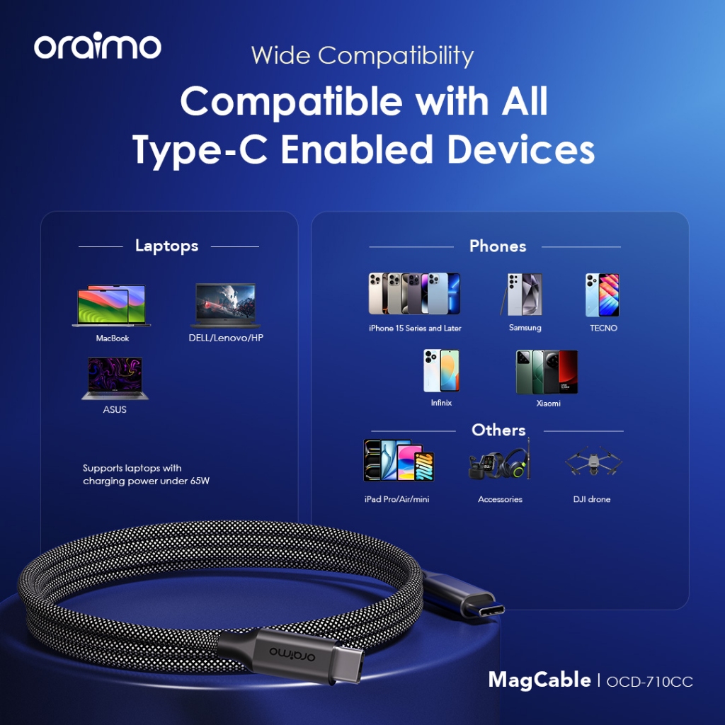 oraimo Magcable OCD-710 Kabel Data Tipe C Lightning 60W 3A Pengisian Cepat Magnetik Anti Kusut 1M Fast Charging Kabel C To C Cas Tipe C Type Magnetic Tangle