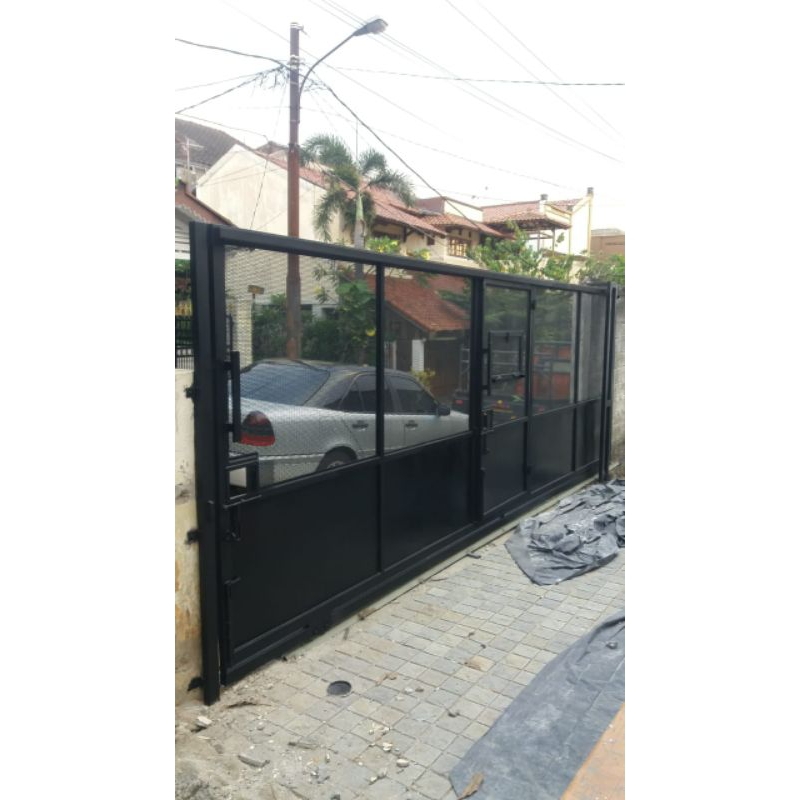 pembuatan pintu pagar dorong tema industrial bahan Expanded metal