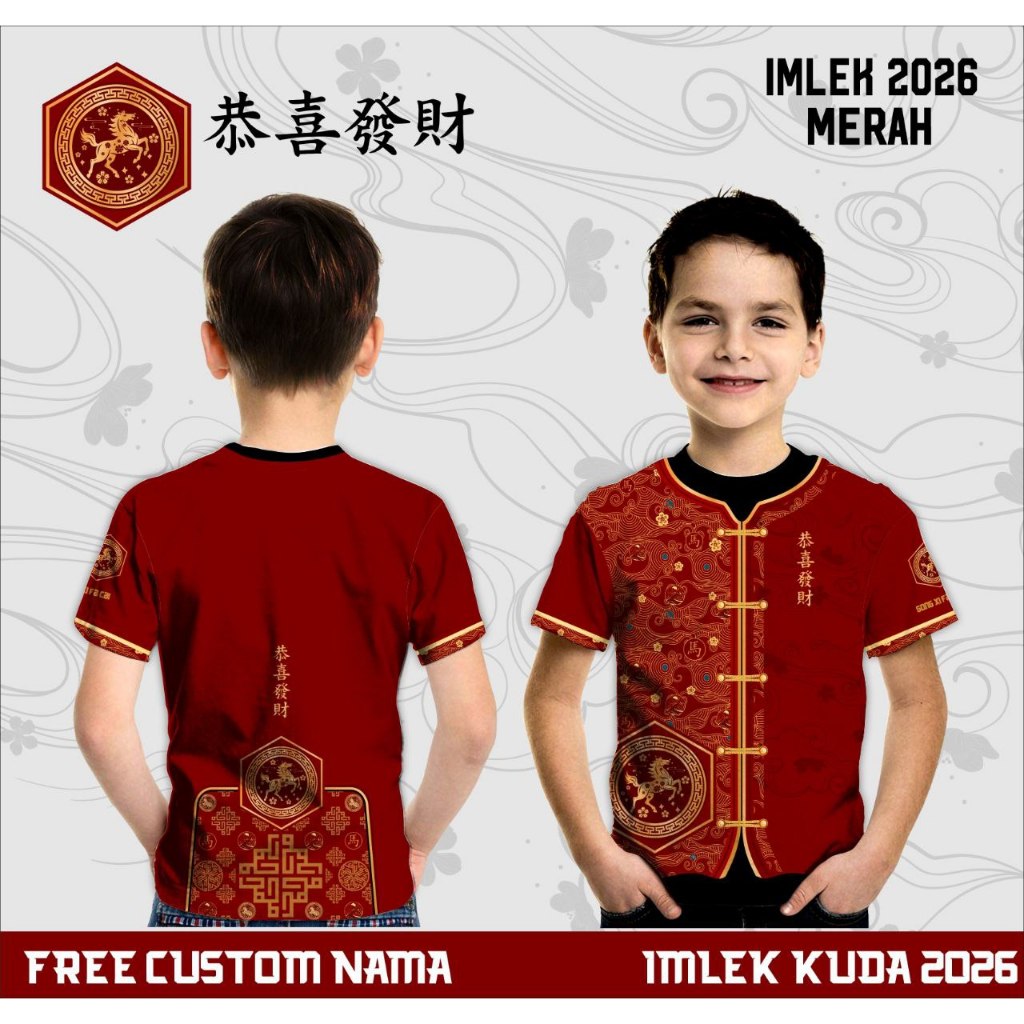 Baju imlek cheongsam anak kaos jesey imlek shio kuda api 2026 free custom