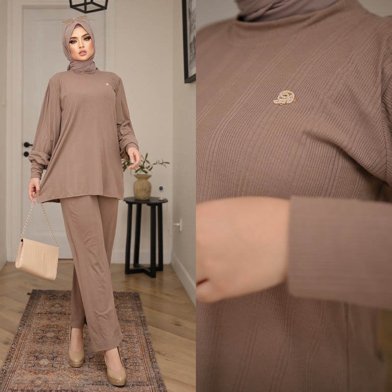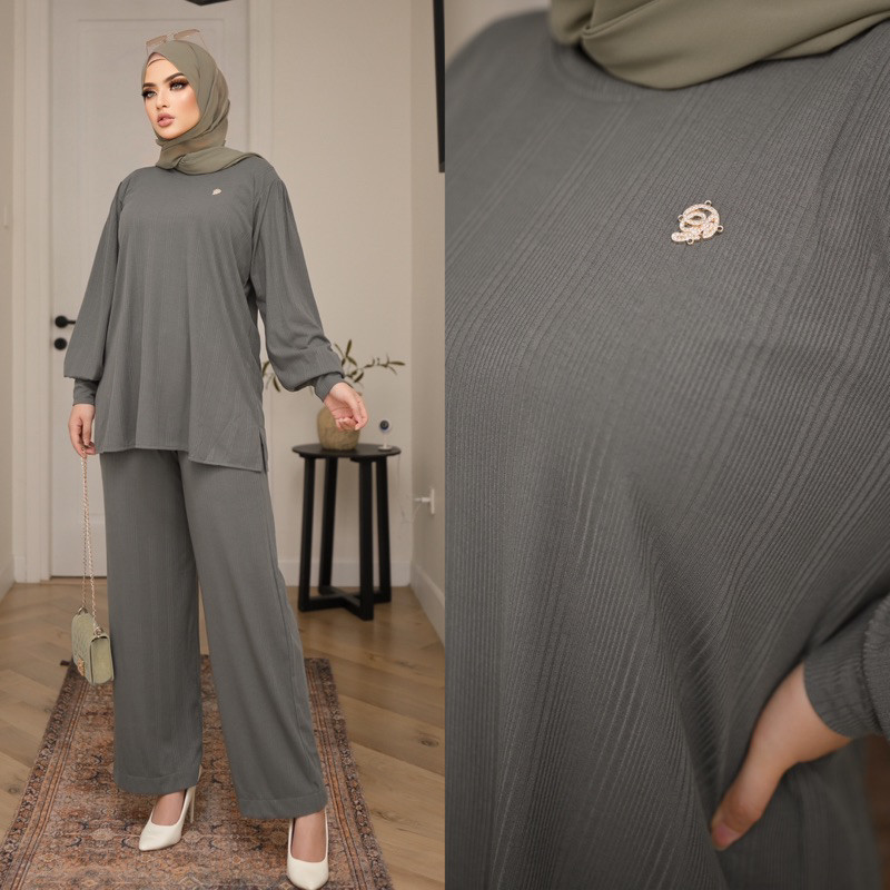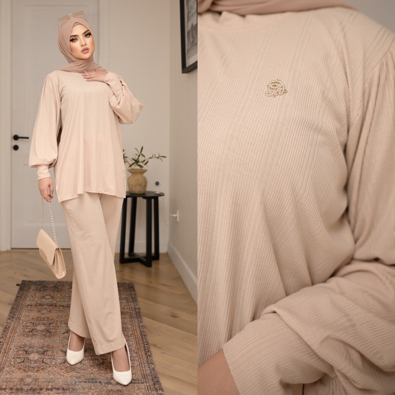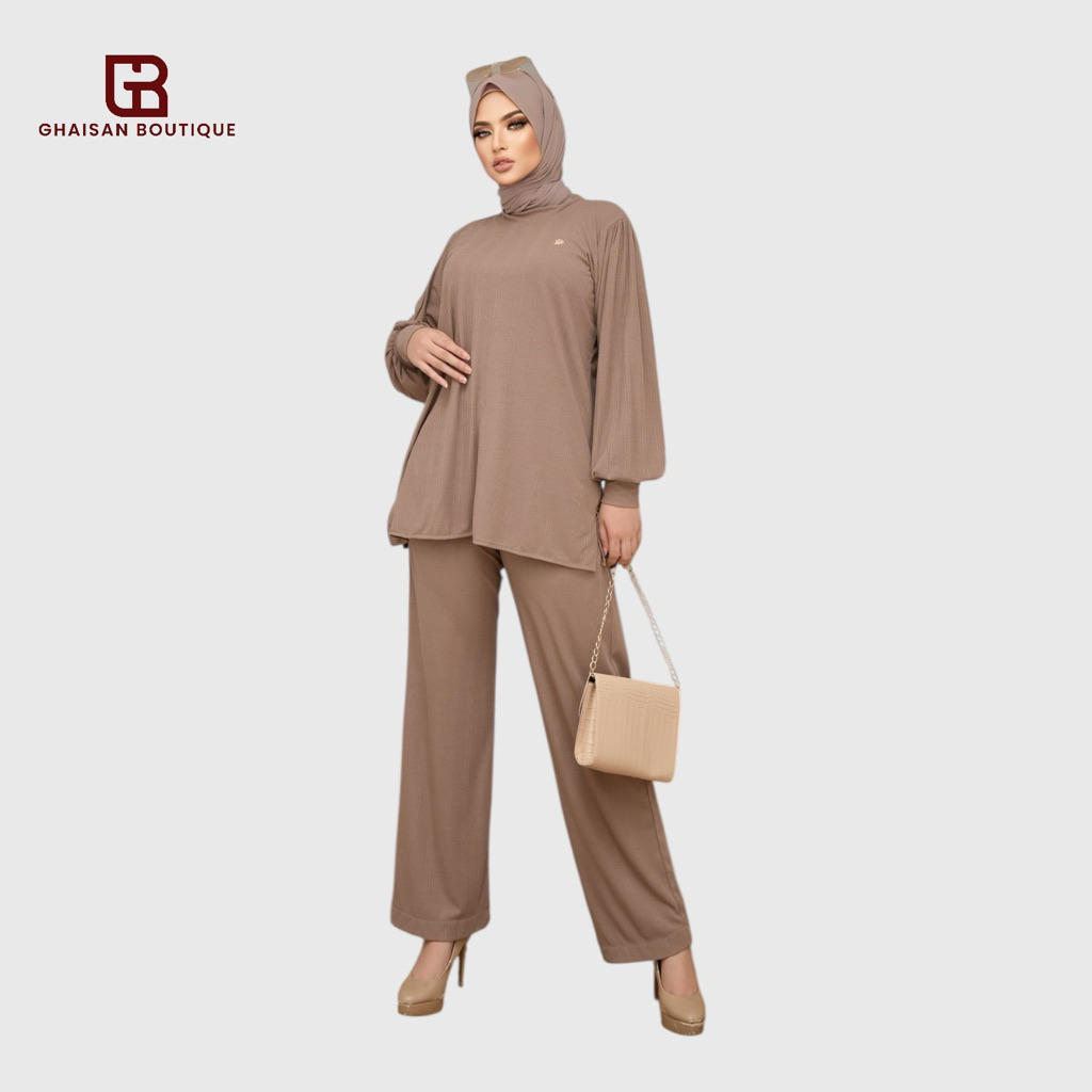Ghaisanboutique | Sheren One Set Lengan Balon | Rib Knit Premium Setelan Baju Atasan Tangan Balon dan Celana Kulot Salur Knit