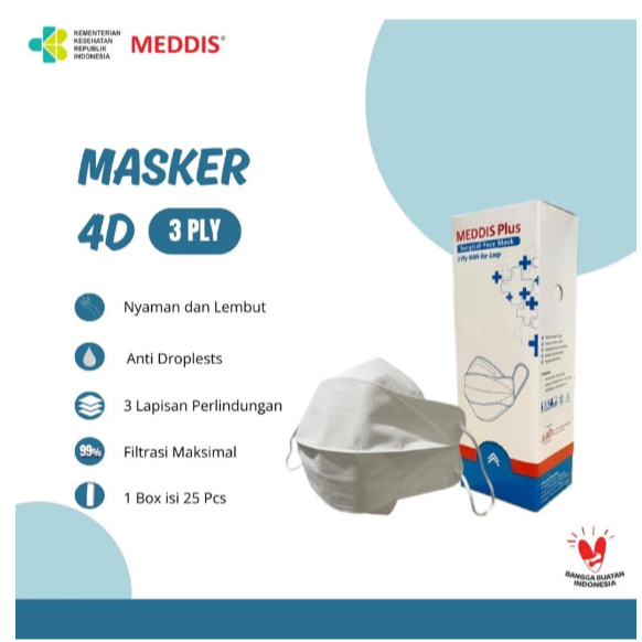 Masker Meddis Plus 3 Lapis 4D Earloop | Masker Medis Isi 25 pcs | Ringan, Nyaman, dan Anti Virus