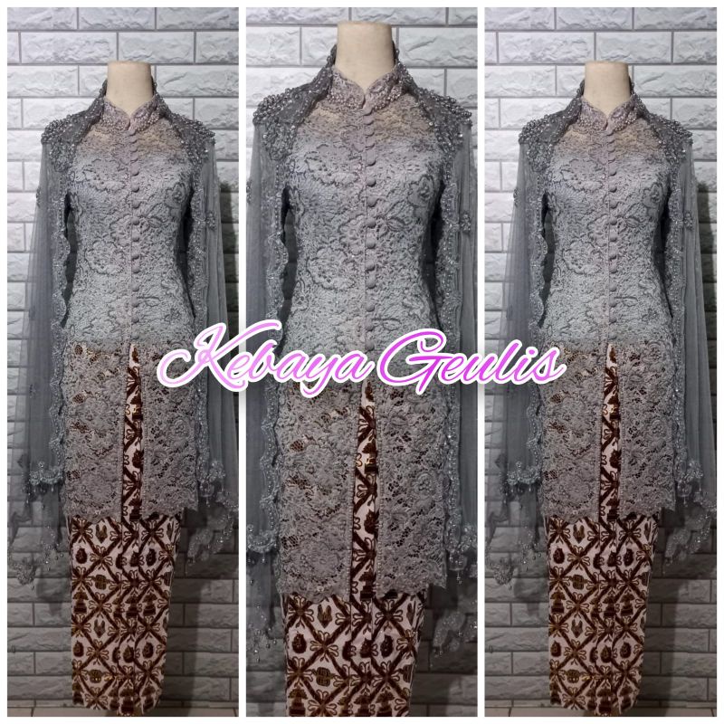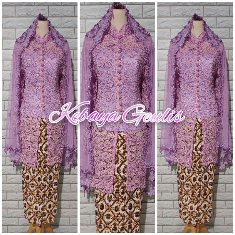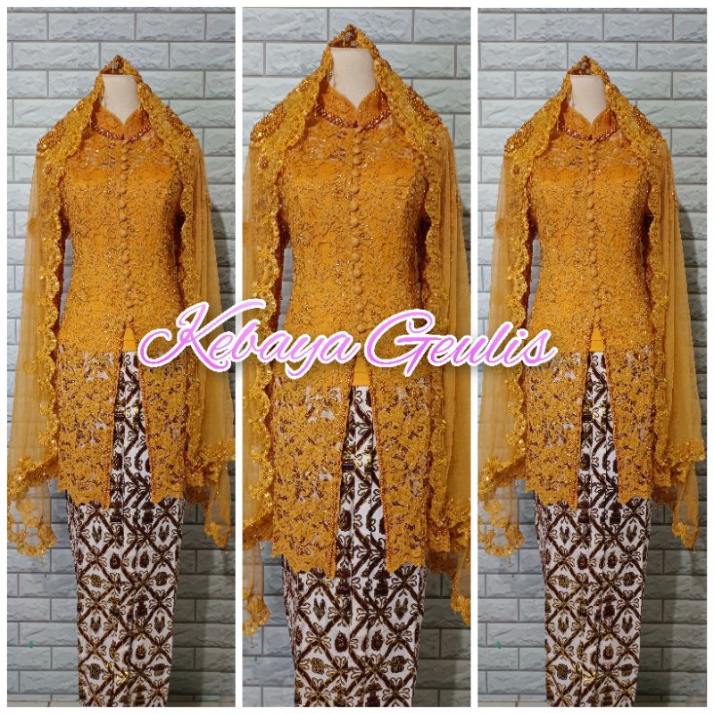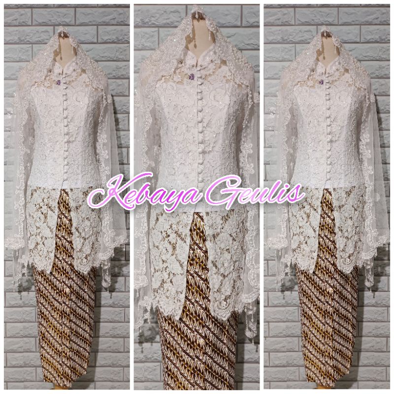 setelan kebaya akad kebaya tunik brukat putih full payet+rok dan selendang mutiara