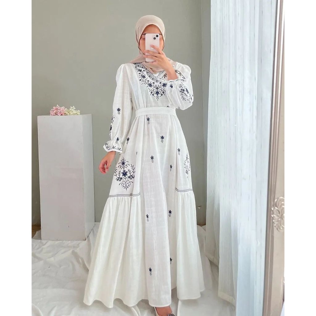 EDELIA DRESS Baju Dress Muslim Wanita Dewasa Bahan Polo Linen Mix Bordir Size M L XL Dress Kondangan Elegan Dress Pantai Style Gamis Lebaran 2024 Viral Bisa COD