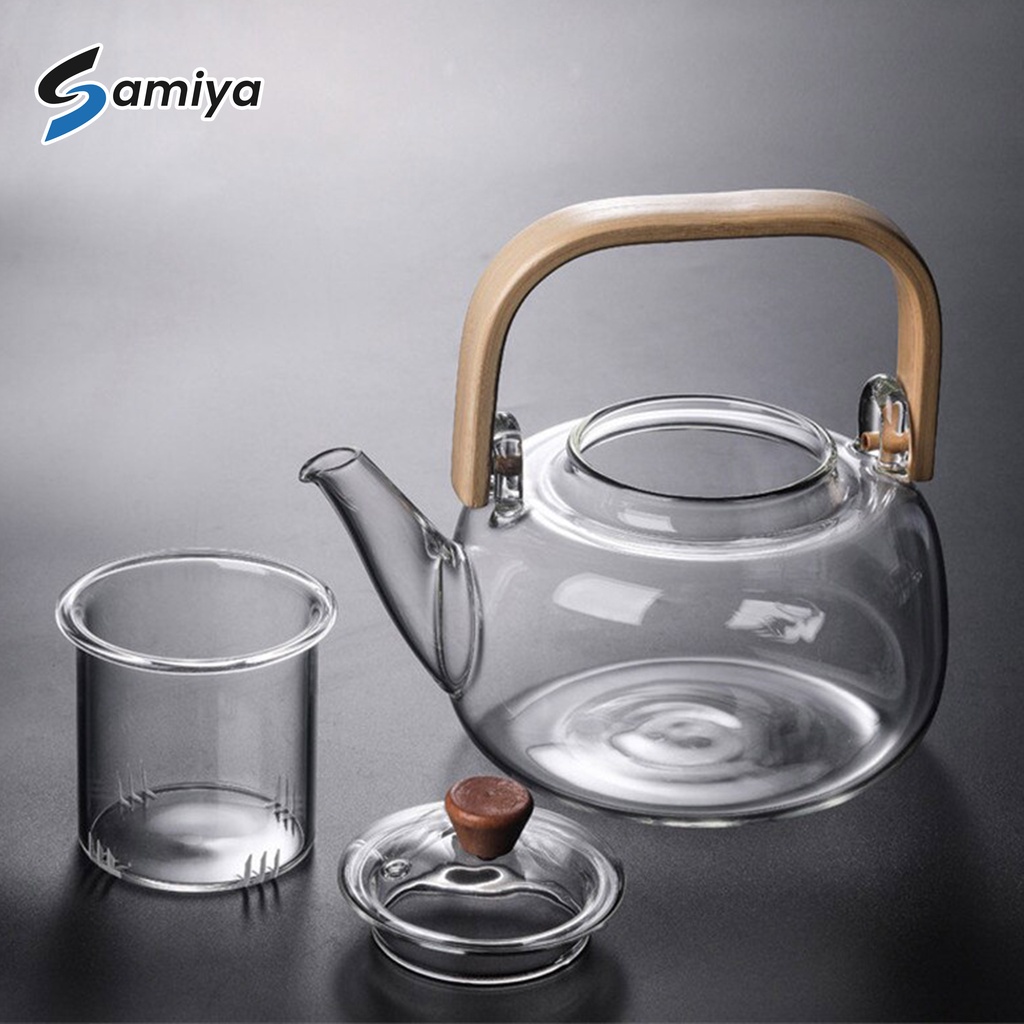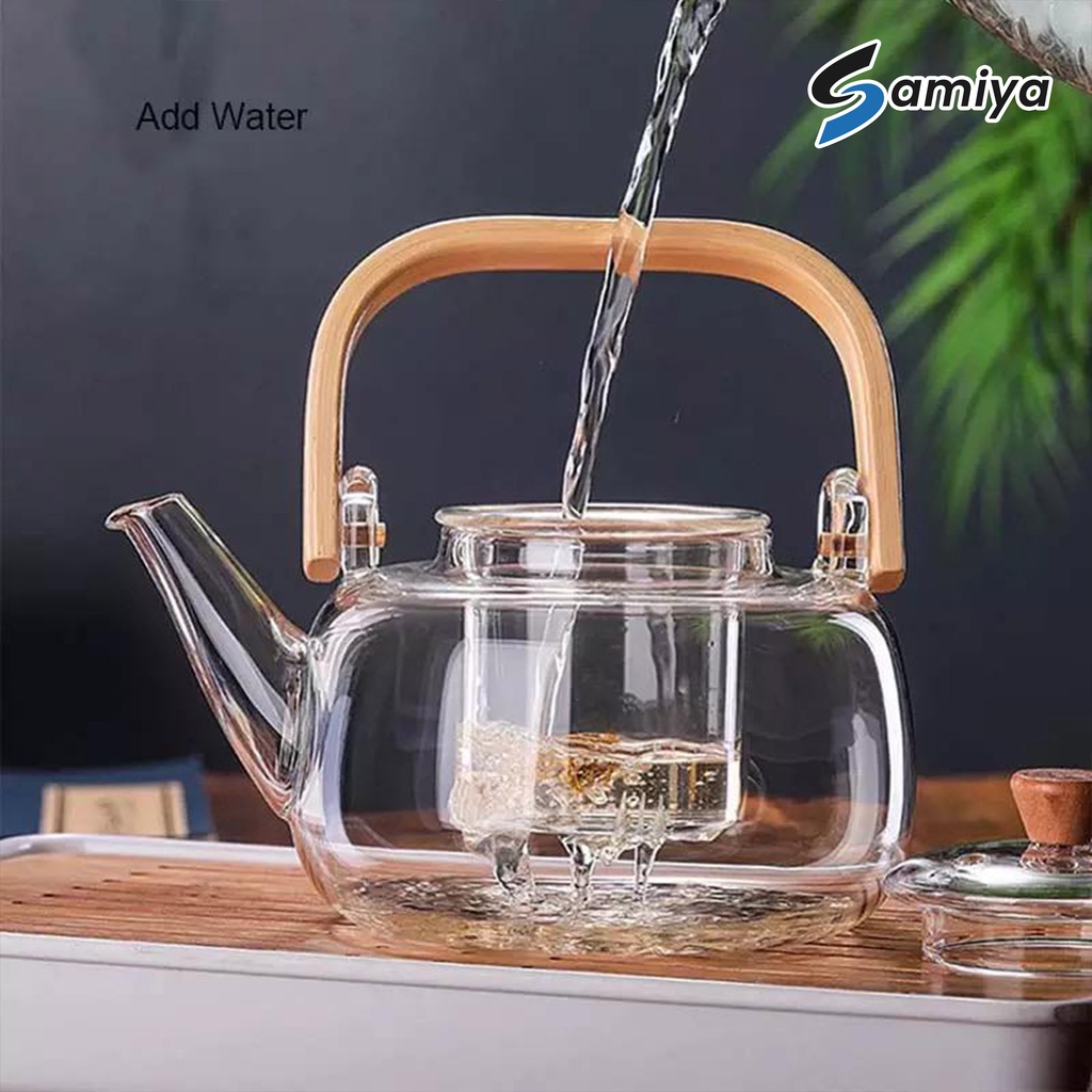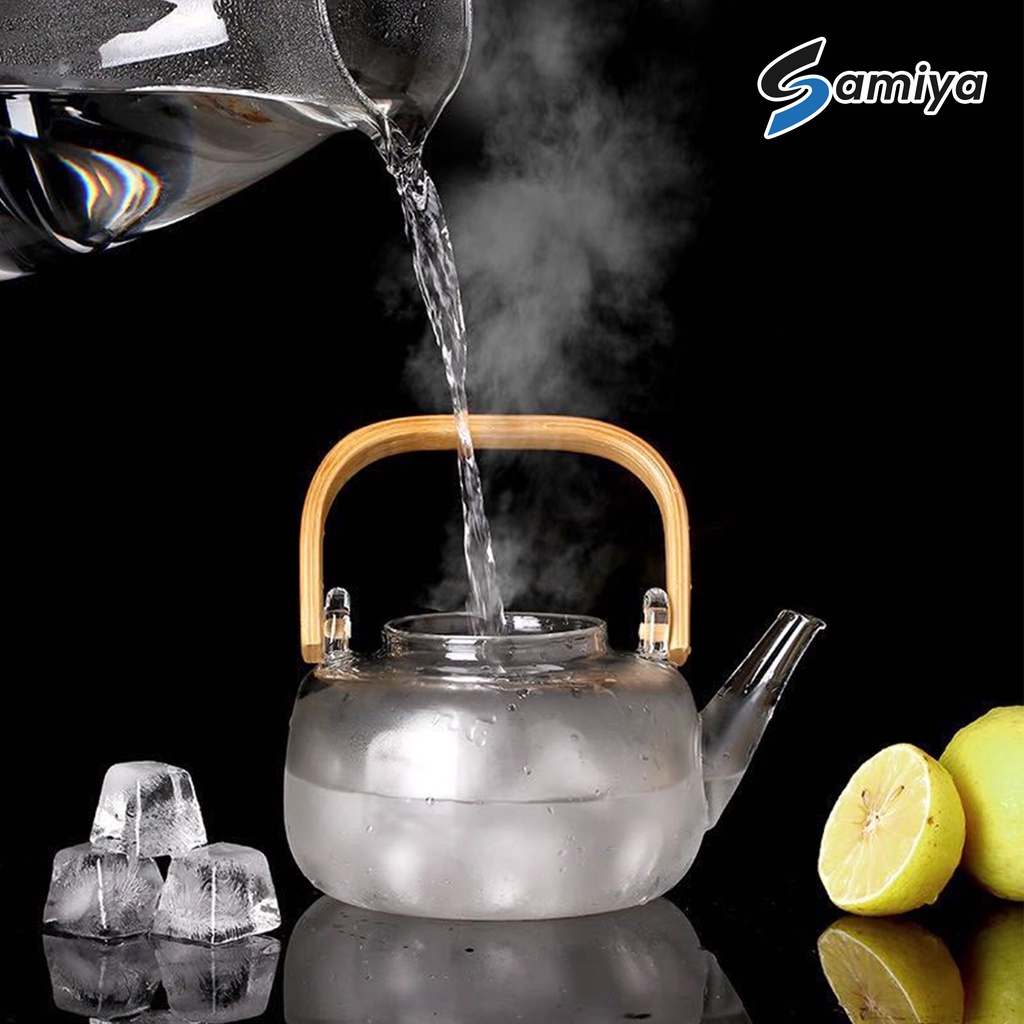 teapot glass bamboo handle heat resistant / teko teh ceret kaca gagang bambu tahan panas dingin