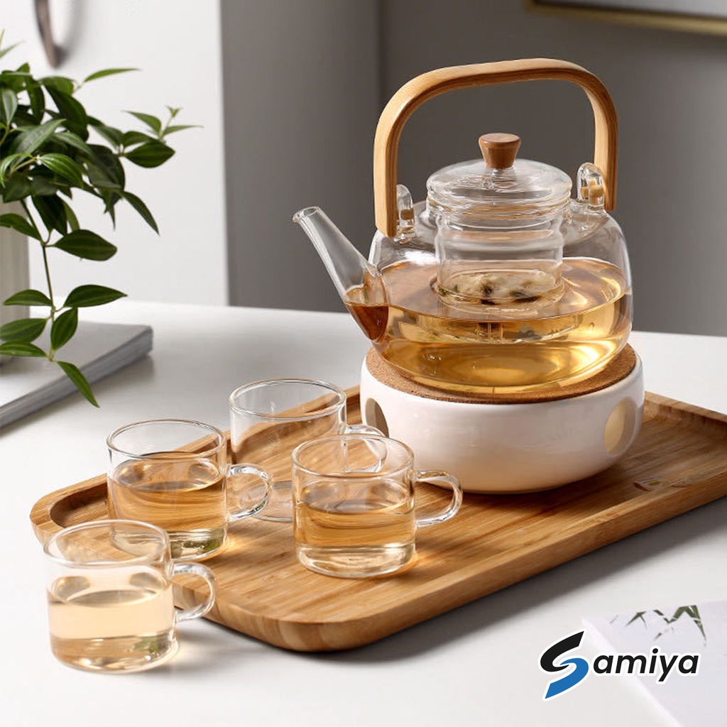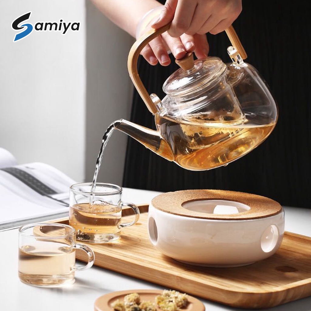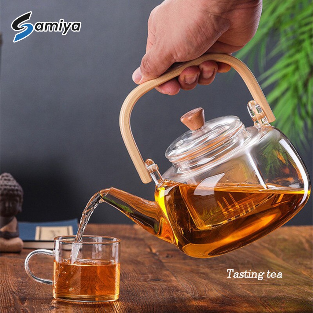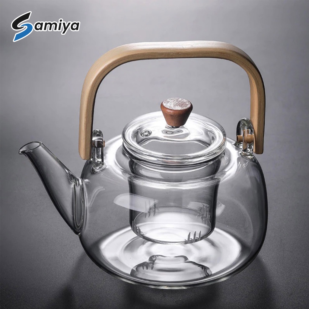 teapot glass bamboo handle heat resistant / teko teh ceret kaca gagang bambu tahan panas dingin