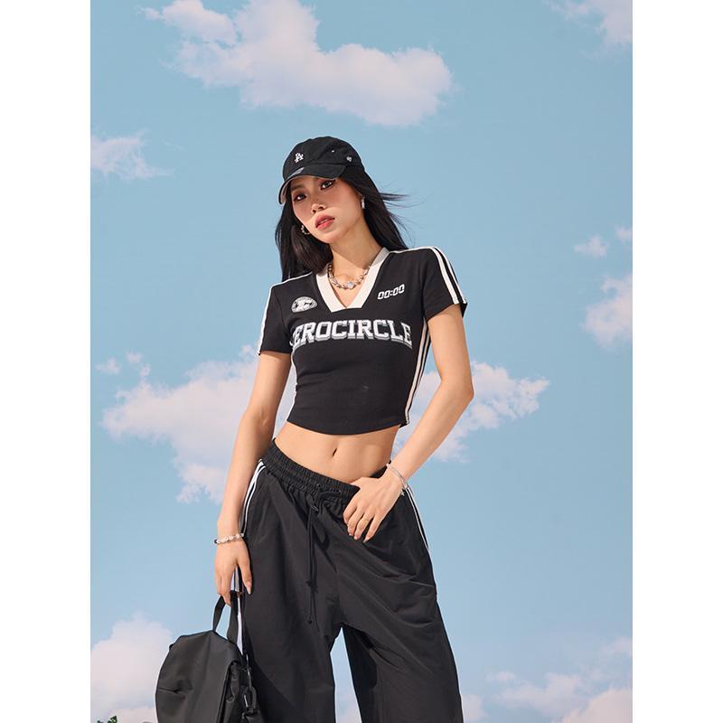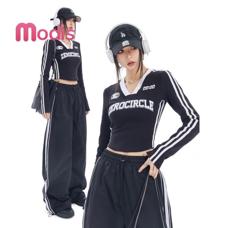 MODIS Crop top baju y2k ketat wanita lengan panjang retro Amerika t-shirt slim short V-neck