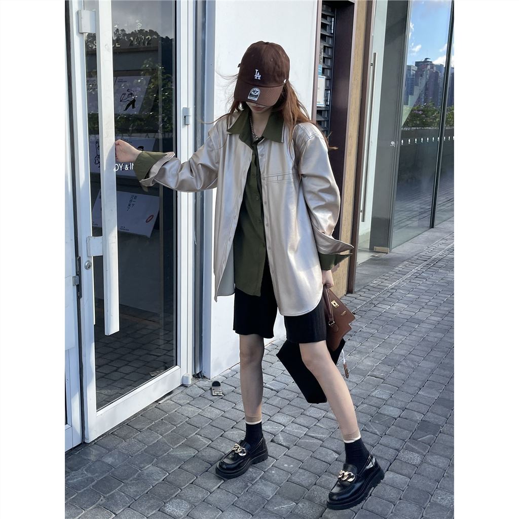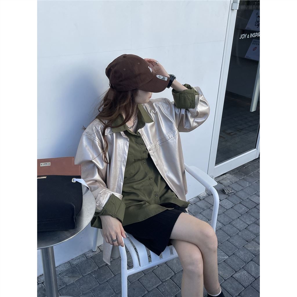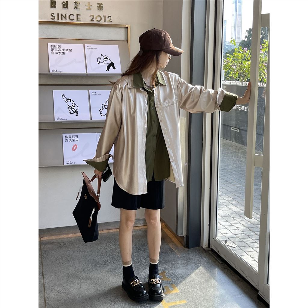 Fashionable Loose Champagne Leather Coat Green Shirt Set for Women