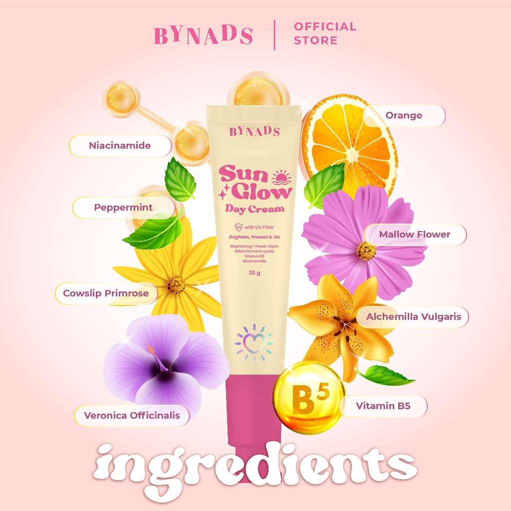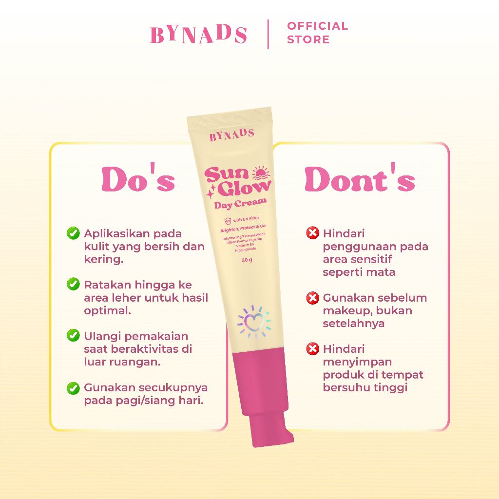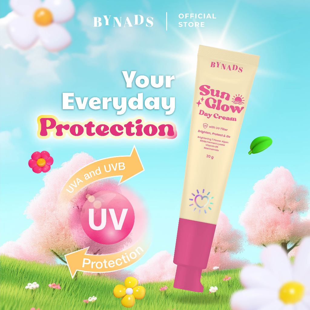 [4PCS] Bynads Sun Glow Day Cream with SPF UV Filter Tone Up Cream Brighten Protect and Go Cream Siang Wajah 30g By Bynads