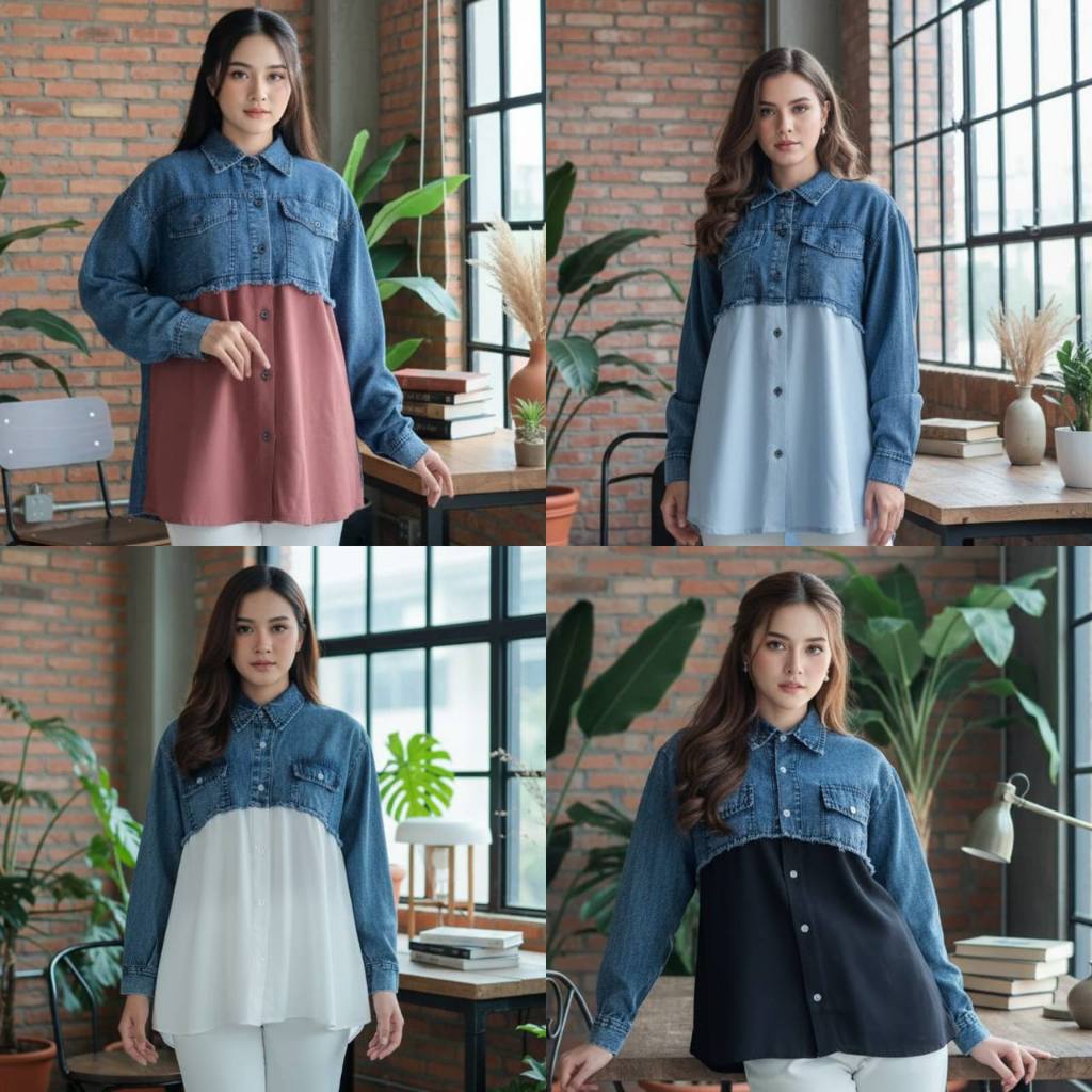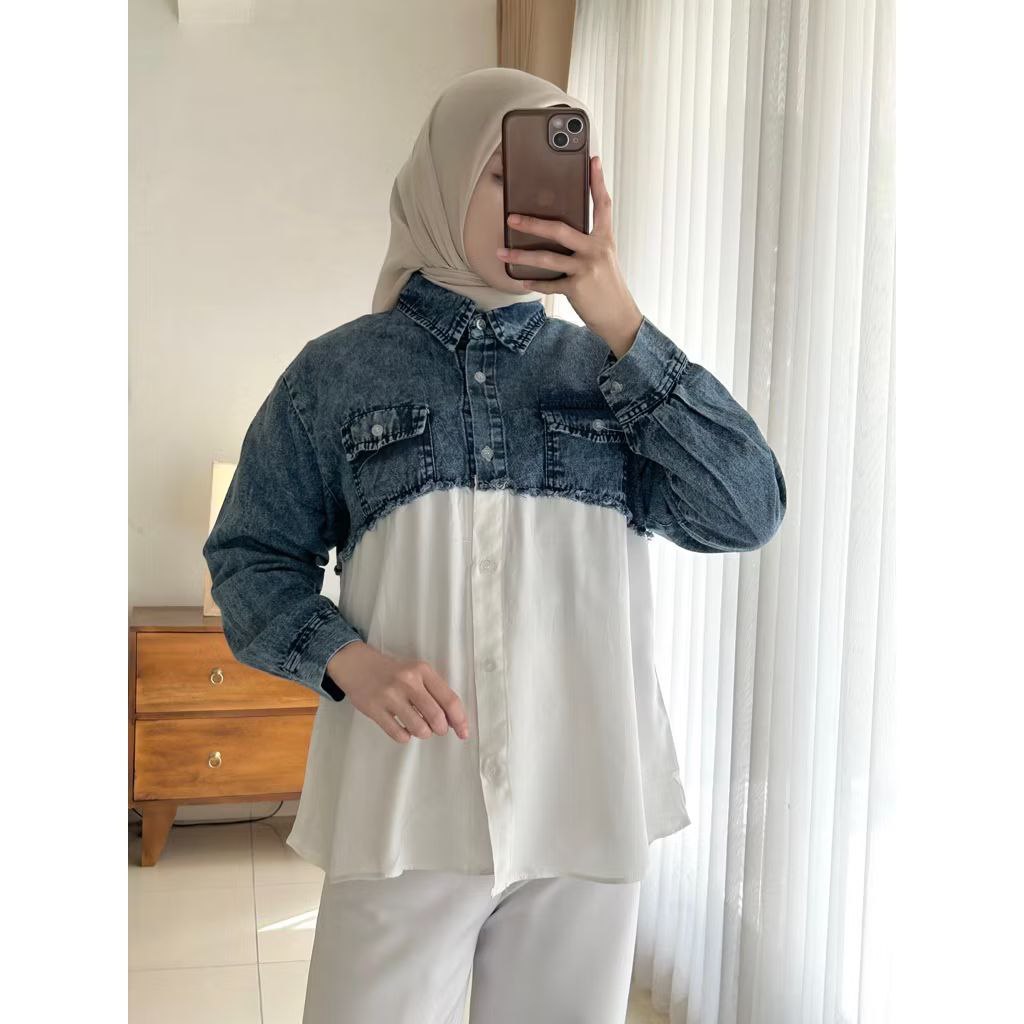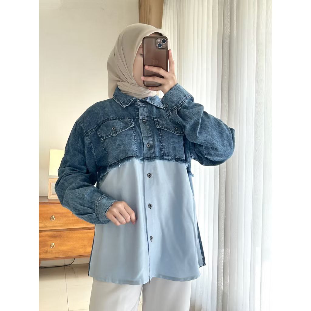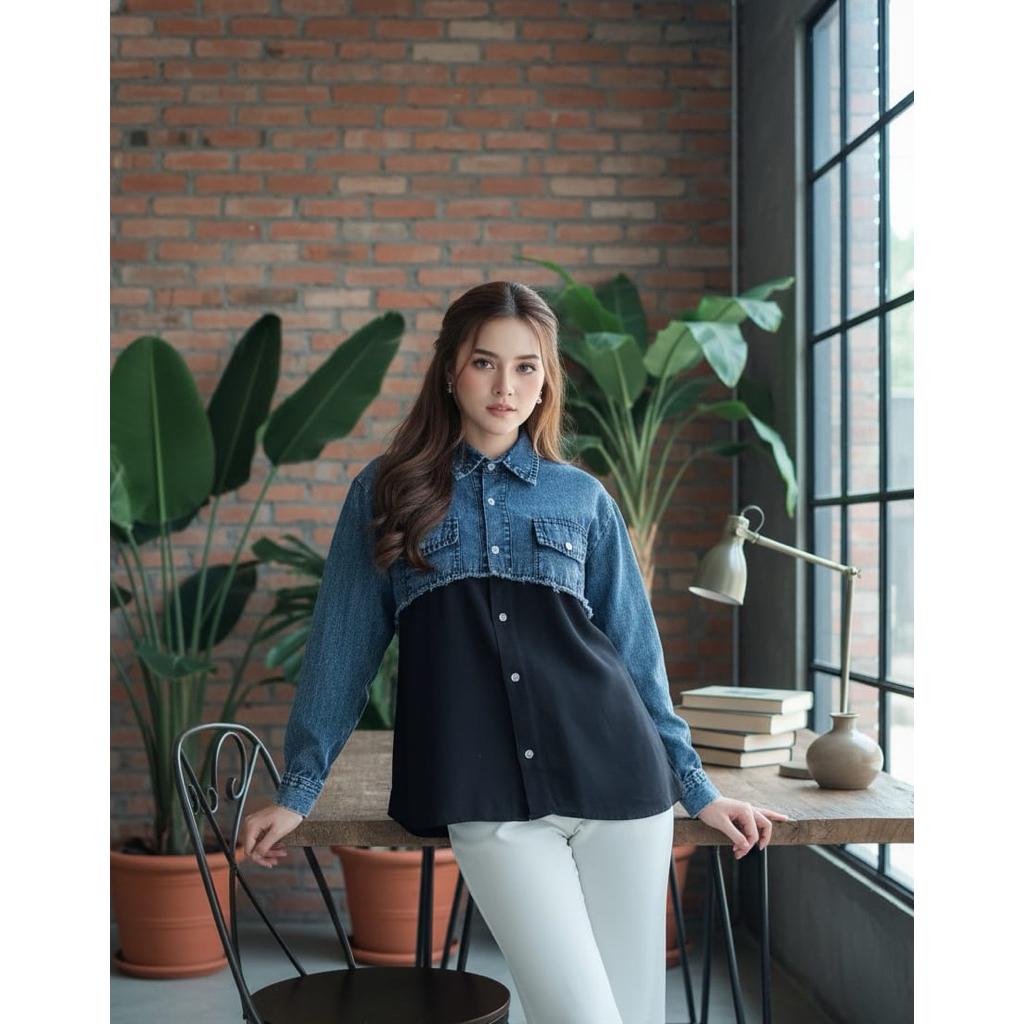 Levia Kemeja Jeans Premium Mix Rayon Rawis Full Kancing Depan Kasual Kekinian Kemeja Wanita Denim 2026