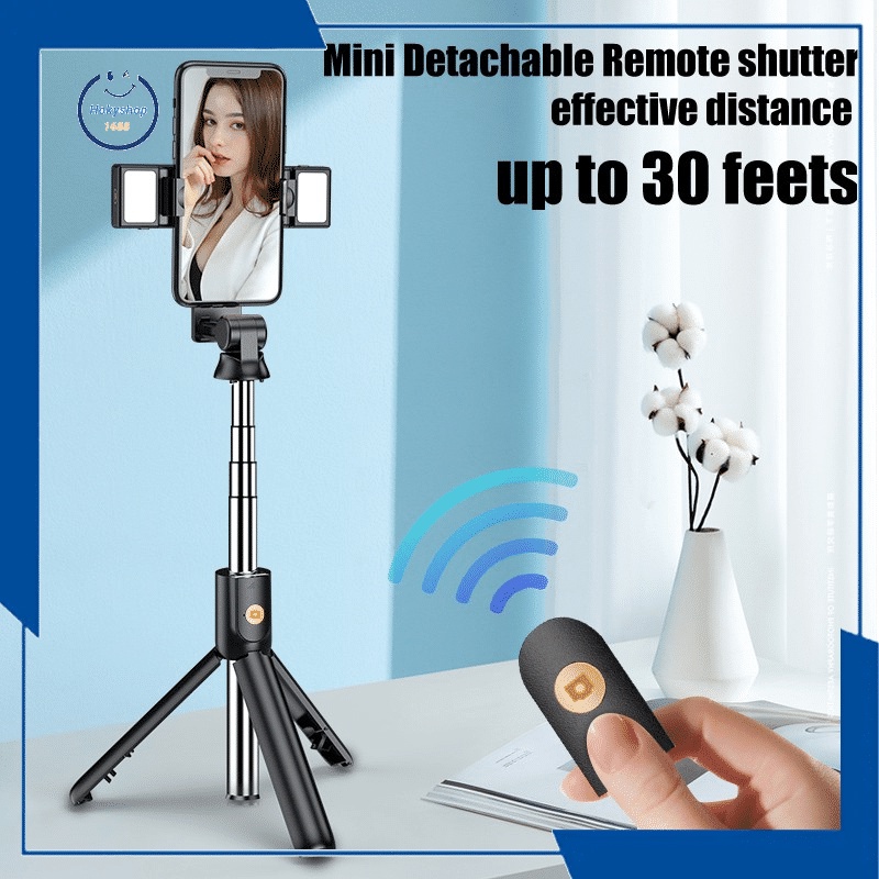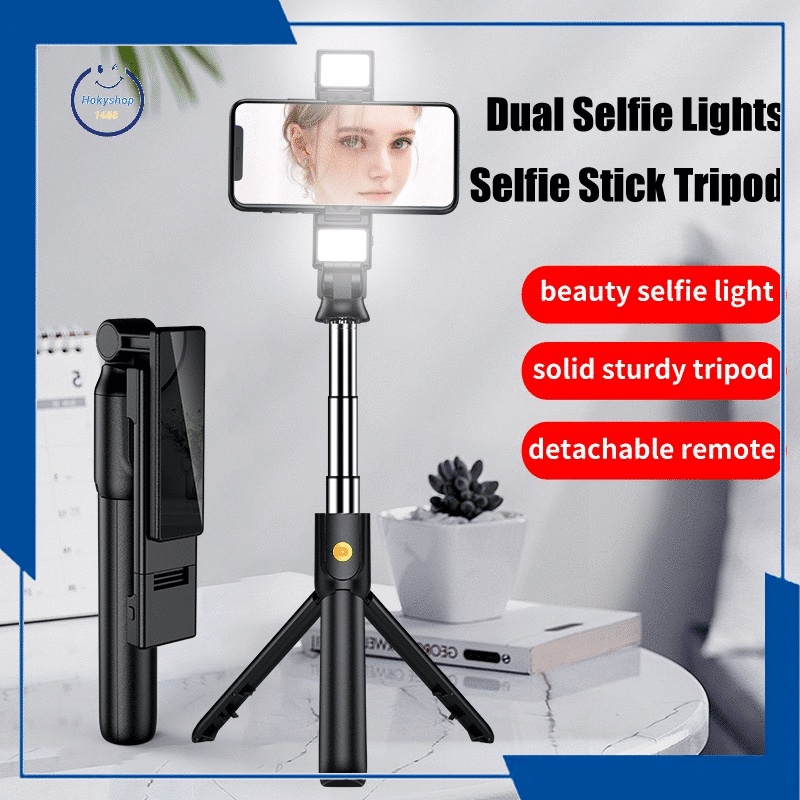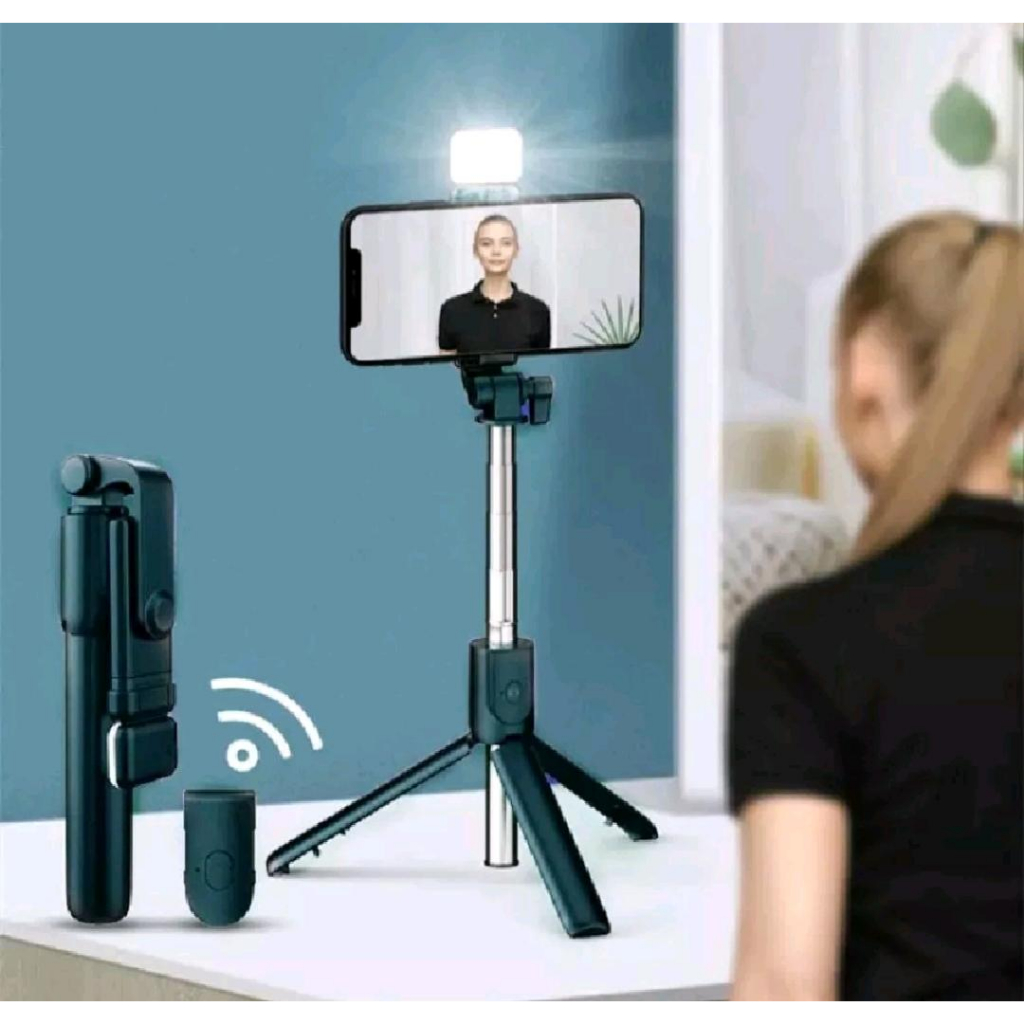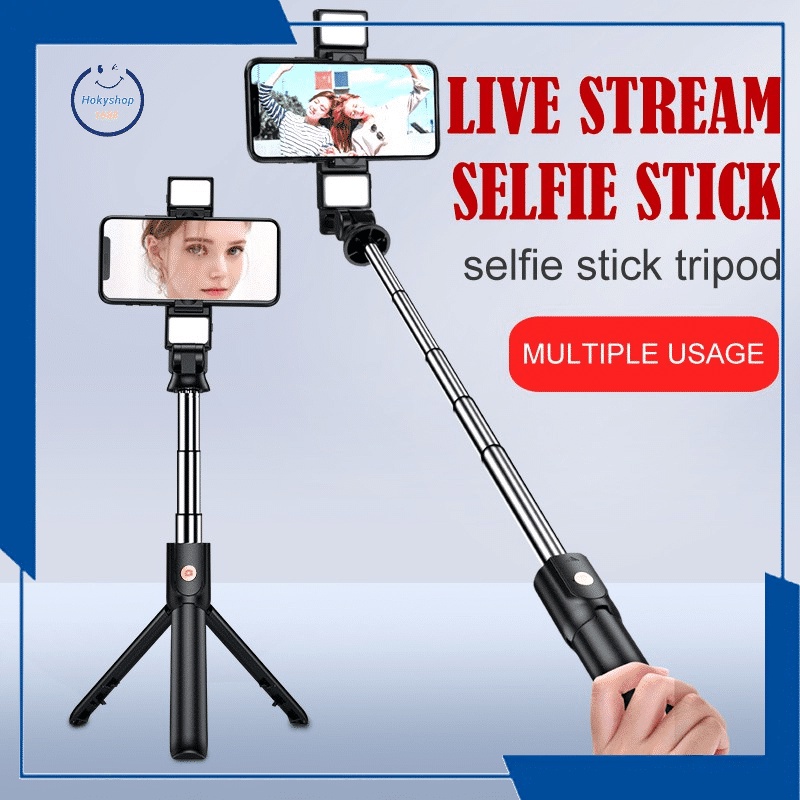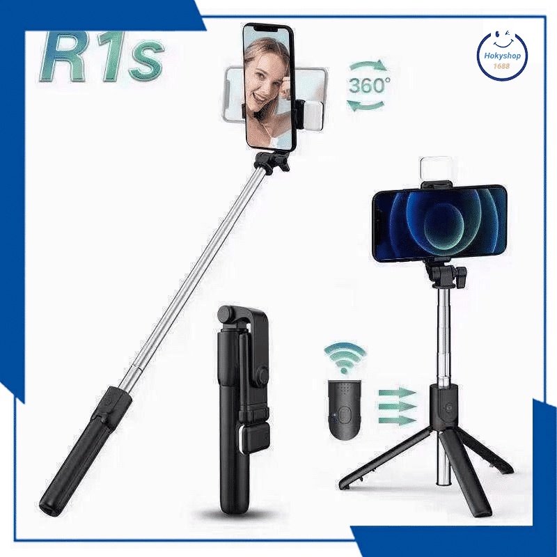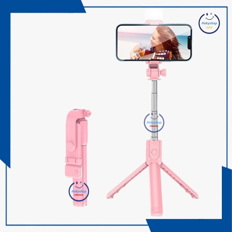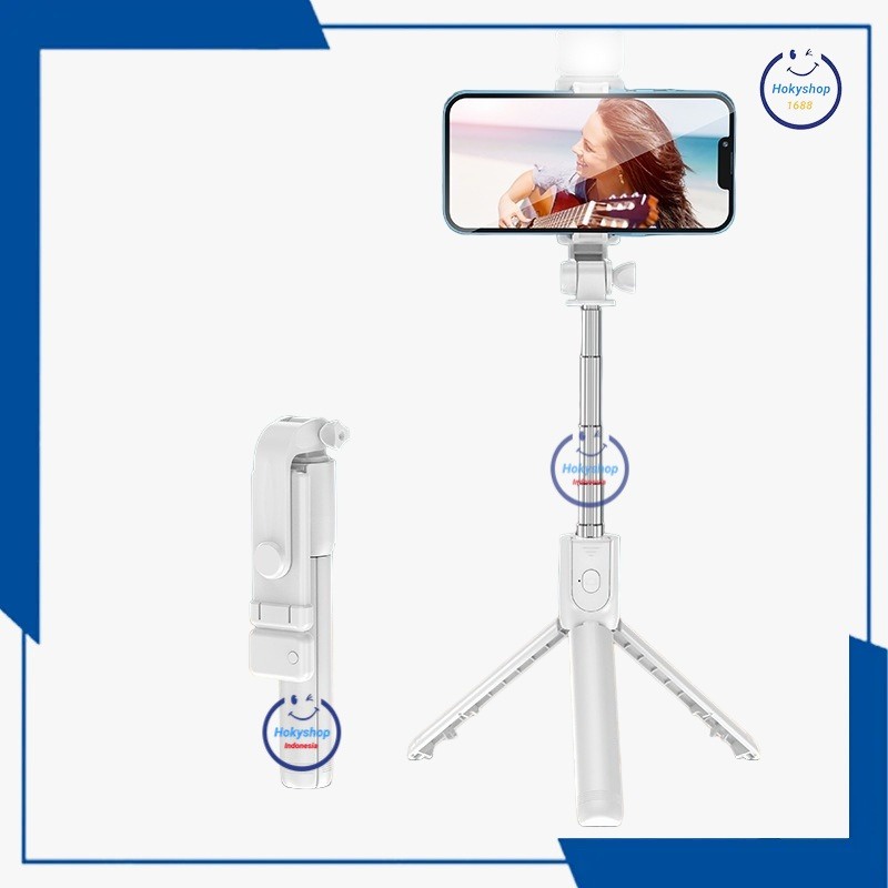 HKS PAKET 5PCS Selfie stick R1S tongsis 4in1 plus Remote Control Bluetooth Tripod Plus Lampu Flash