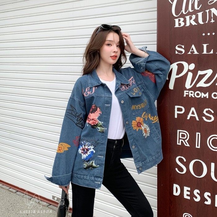 Lassie alpha JW02 Jaket denim jeans sablon motif biru jaket Jeans wanita Oversize jaket outer korean