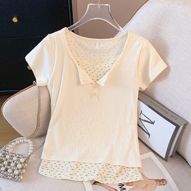 Kaus Lengan Pendek Dua Potong Palsu Jahitan Renda Biru Atasan Ketat Seksi Fashion Wanita Gaya Korea
